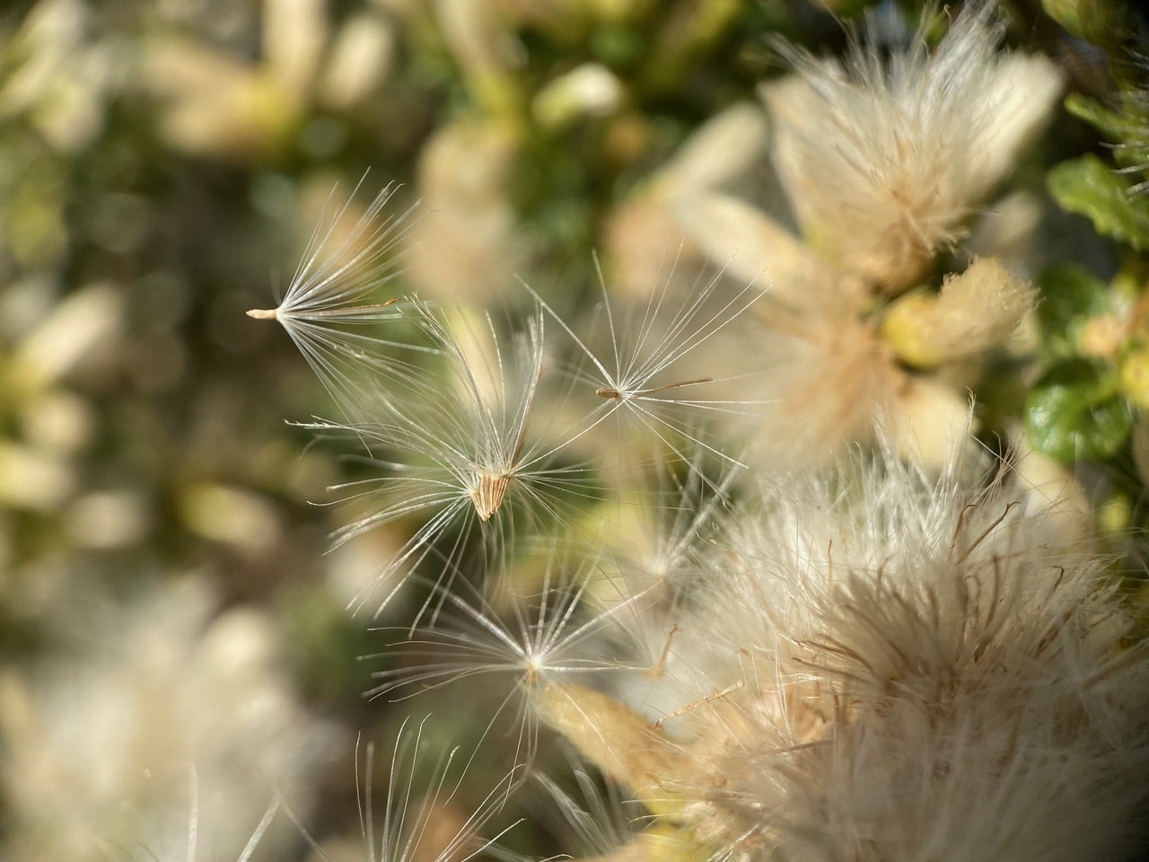 Each tiny seed is contained in an achene attached to a cluster of silvery white fibers or the pappus. In Asteraceae, the pappus is a modified calyx, the part of an individual floret, that surrounds the base of the corolla tube in flower. It functions as a dispersal mechanism for the seeds. By creating a separated vortex ring in its wake, the flight of the pappus is stabilized and more lift and drag are produced. As a result, the achenes are carried a longer distance on the wind before landing. Nature’s genius knows no bounds!