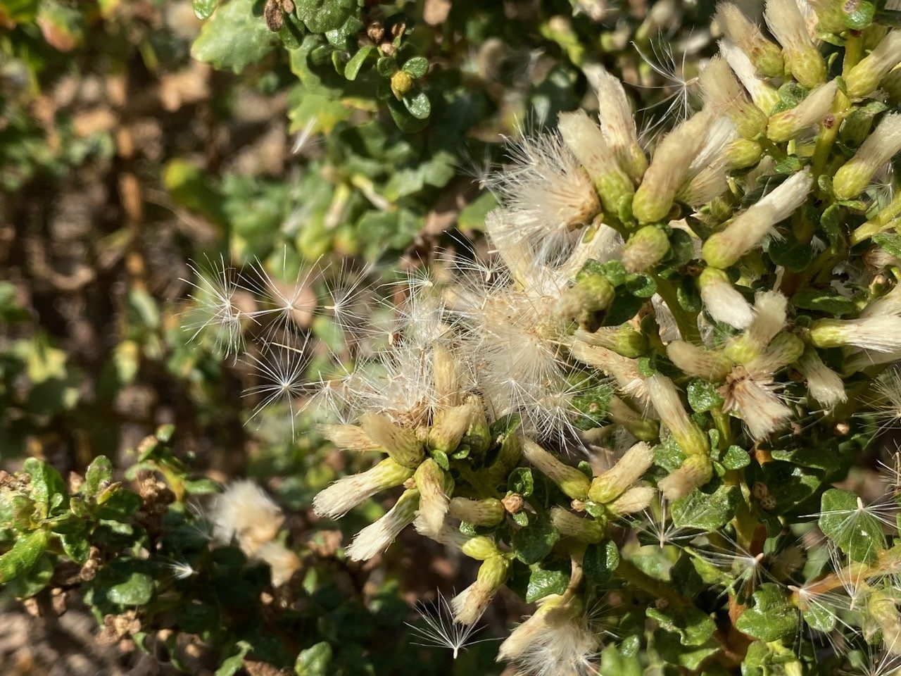 The female Coyote Brush, Baccharis pilularis by the side of the paved path is already releasing its seeds! This is the time of year when the genders of the dioecious plant can be easily distinguished. Female plants are dressed up in billowy white plumes.