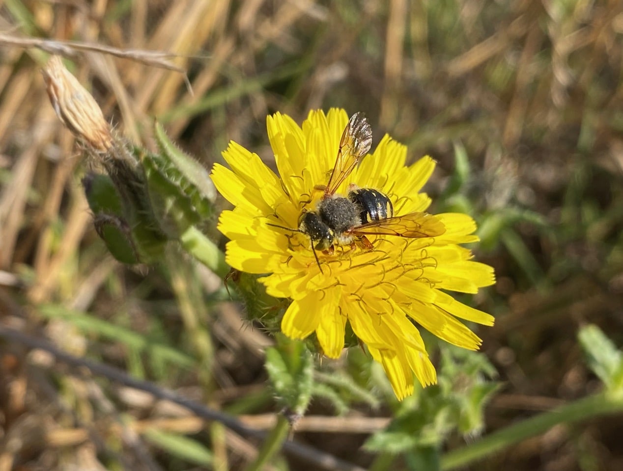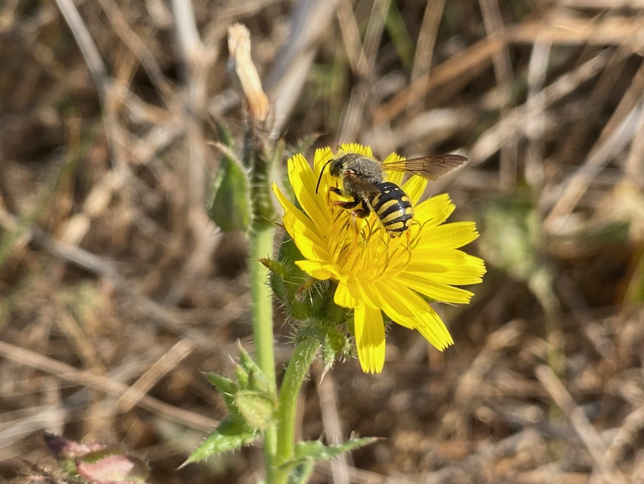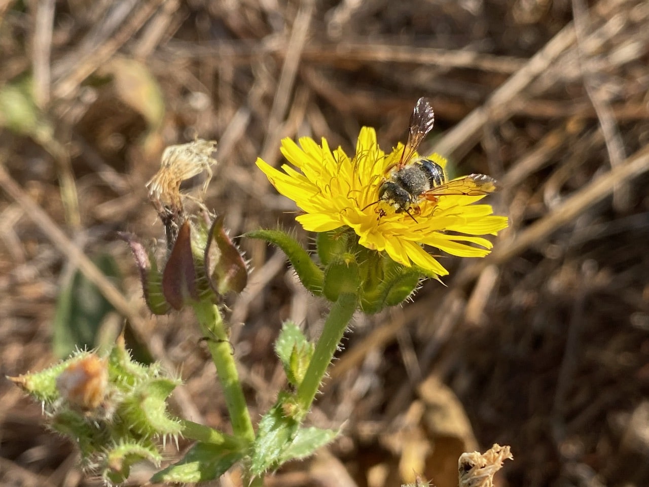 Ooh, a small bee has landed on a flowerhead of Bristly Oxtongue, Helminthotheca echioides. It holds up its orange-tinged wings wasp-like the whole time it is foraging.