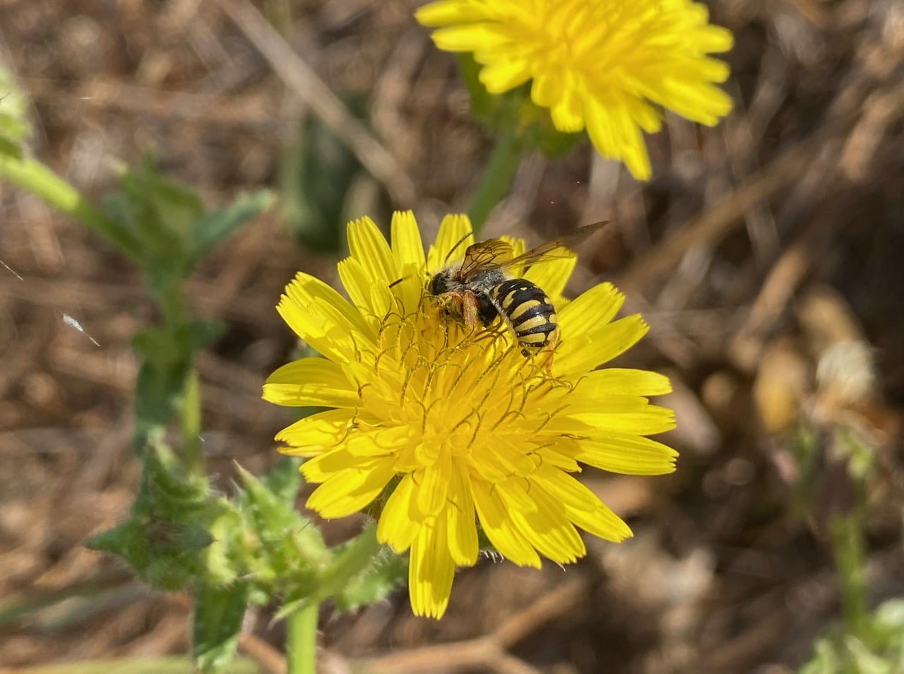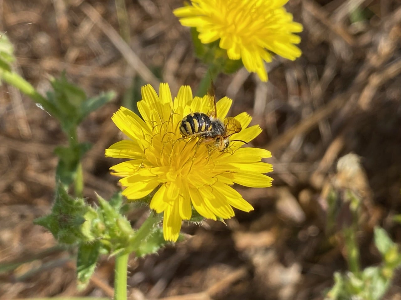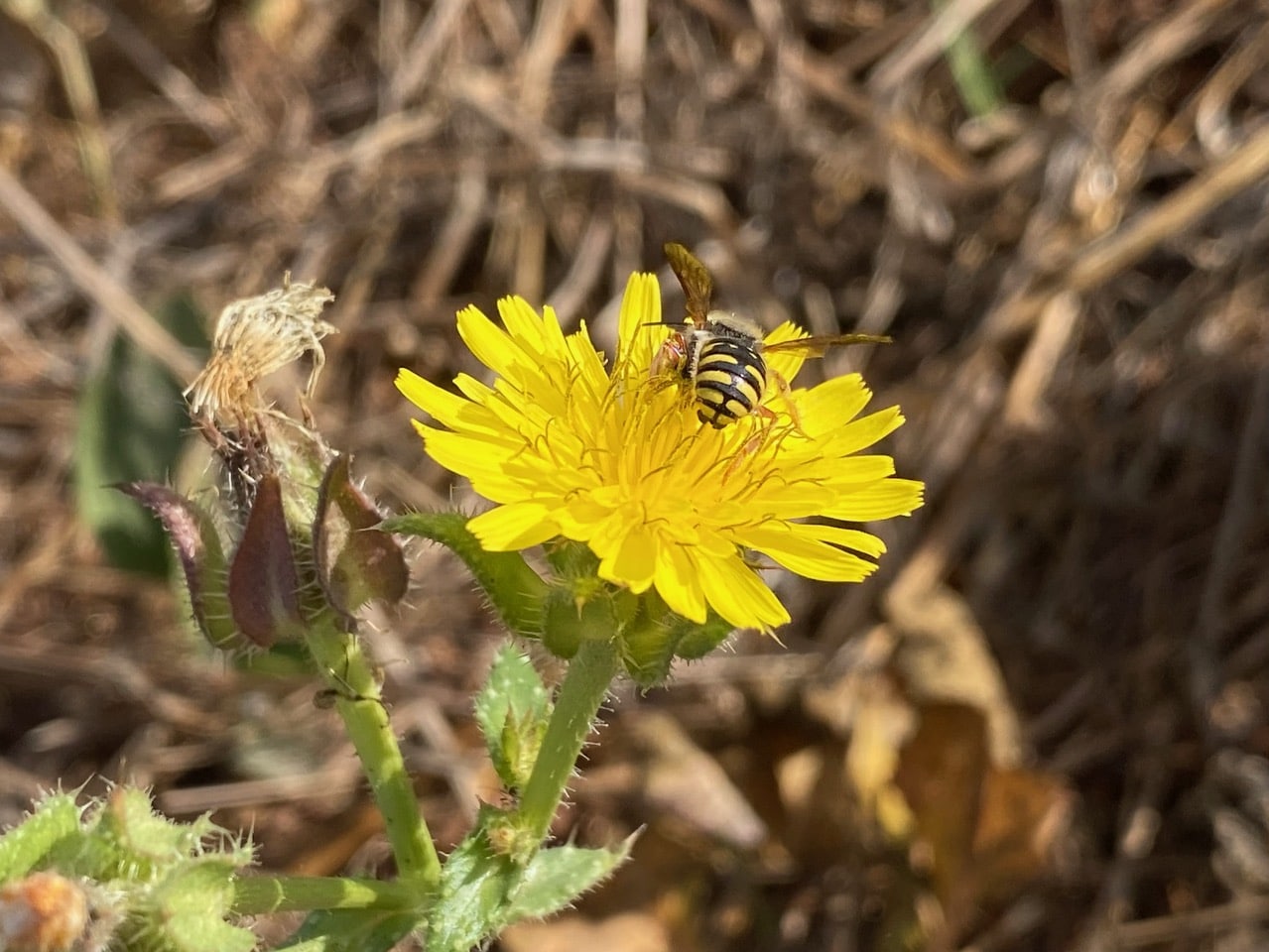 Ooh, a small bee has landed on a flowerhead of Bristly Oxtongue, Helminthotheca echioides. It holds up its orange-tinged wings wasp-like the whole time it is foraging.