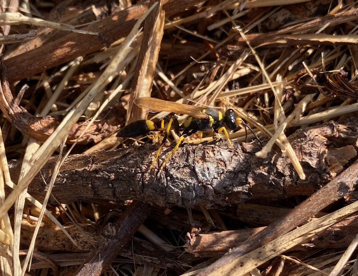 Stepping into the wet section of the trail, I keep a lookout for the Mud Daubers collecting mud for their nest construction. Sure enough, here’s one running around on the leaf litter by the path.