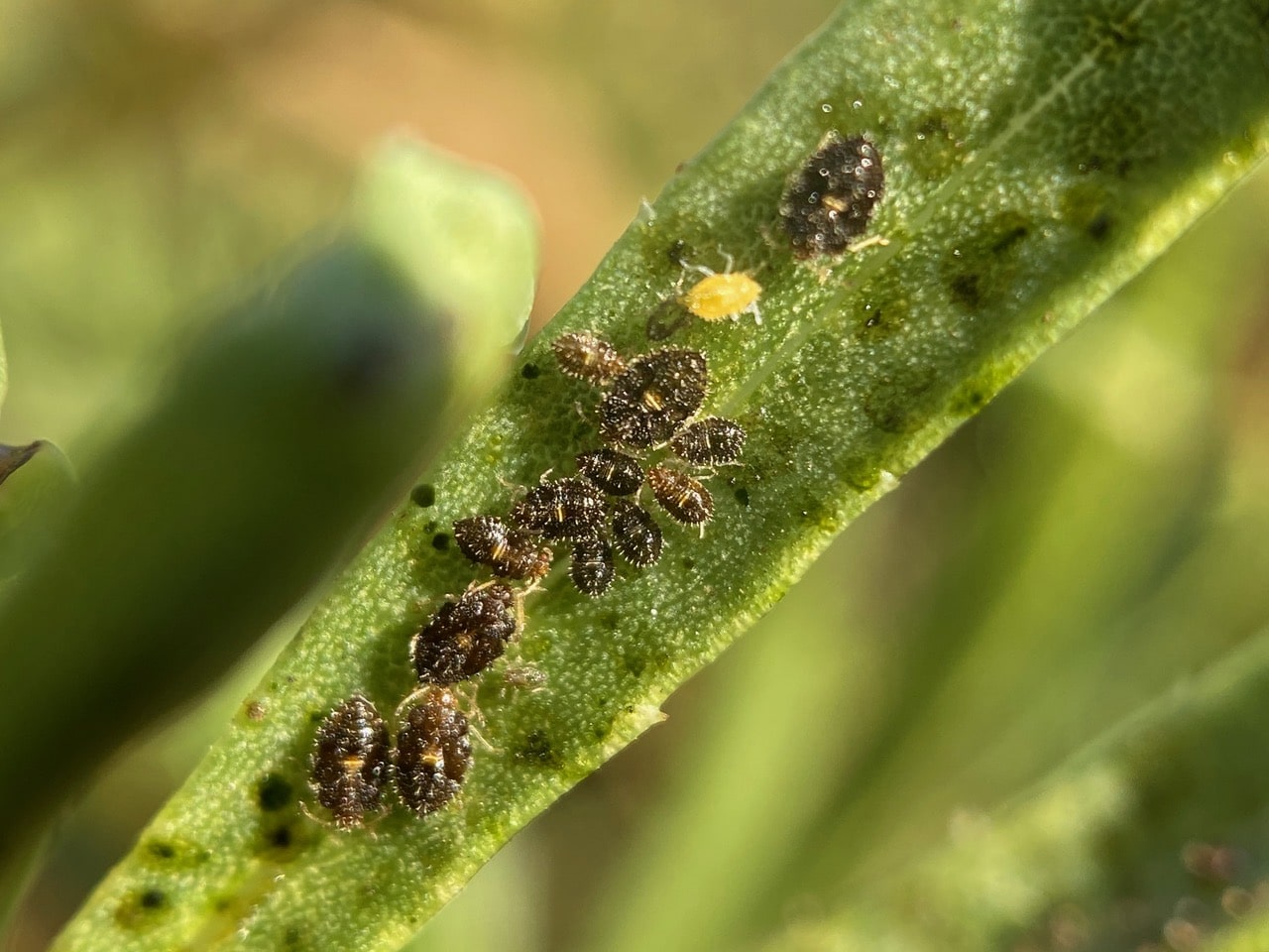 These are the bristly black nymphs of the Lace Bugs, Corythucha sp. (family Tingidae). The yellow one might be a freshly molted nymph.