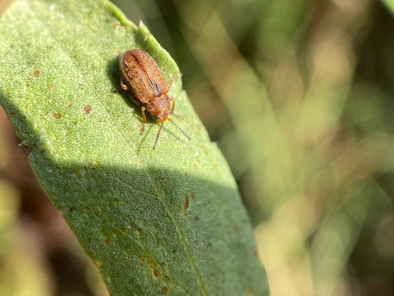 A tiny Leaf Beetle (family Chrysomelidae) is resting on a Grindelia leaf.