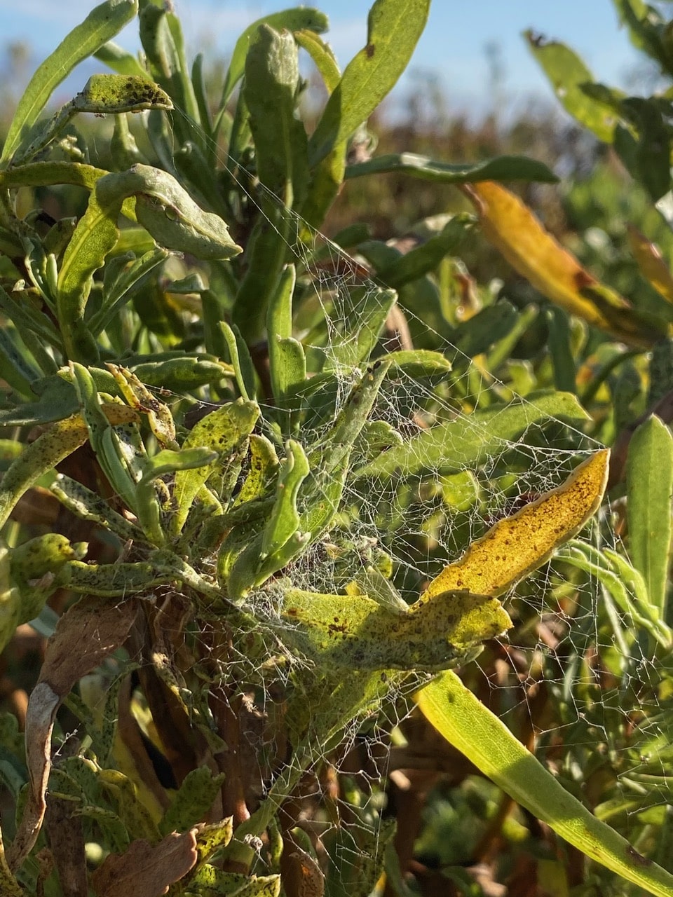 A similar spider web has been constructed on a live but yellowing Grindelia. The web most likely belongs to a Grey House Spider, Badumna longinqua (family Desidae).