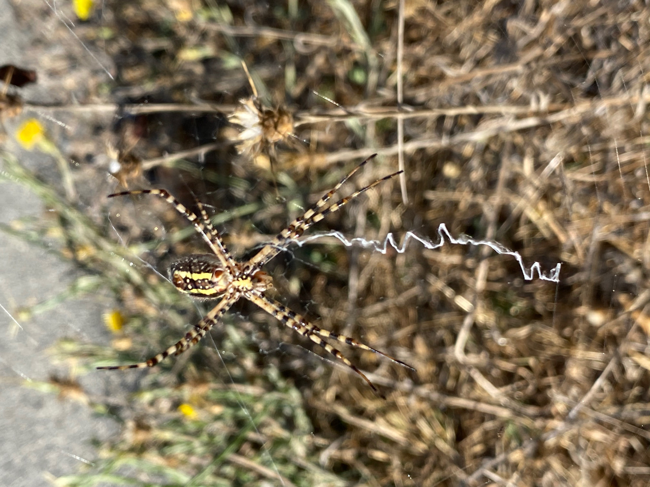 A female Banded Garden Spider, Argiope trifasciata (family Araneidae) is resting head-down in her orb web among dried Yellow Starthistles. We are looking at her underside. Most Argiope webs are built with a slight tilt from the vertical, and the resident spider is always found on the side facing the ground. This arrangement enables the spider to drop from the web quickly without getting entangled. The other, more conspicuous feature of the Argiope web is the stabilimentum, the zig-zag decoration made of thick silk.