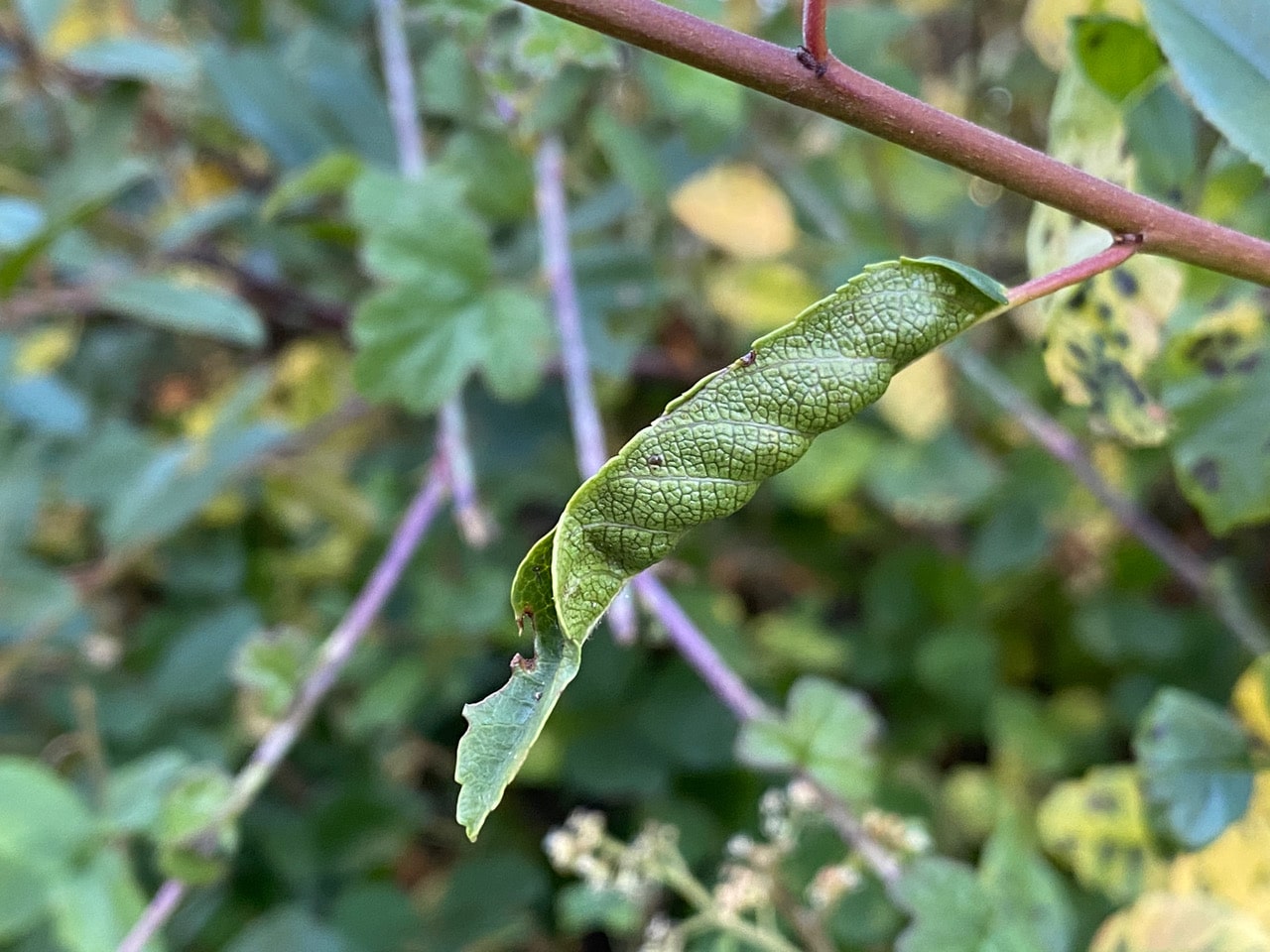 Aww, the mature Pale Swallowtail caterpillar I found on this Coffeeberry leaf three days ago is longer there. I am hopeful that it has left in search for a place to pupate. Pale Swallowtail caterpillars typically do not pupate on their host plant. Have a safe and snug time in your chrysalis until spring, little feller!
