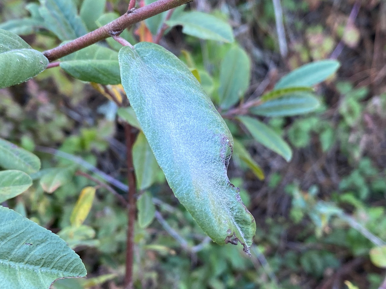 Hey, this is one of the fun things I find every fall! See that Coffeeberry leaf that has been folded along the midrib into an elongate bloated structure? The edges of the leaf has been very neatly bound together with silk. It is a leaf gall induced by the Midrib Gall Moth, Sorhagenia nimbosa (family Cosmopterigidae). The galls are the result of a significant expansion of the tissues in and around the midrib. These rigid, thick-walled galls occupy most to the affected leaf with only the basal and apical portions of the leaf unaffected. The single caterpillar feeding inside is brown with a darker head, and is 6 mm long. Galls appear in mid-May along the California coast. Most of the older galls have an exit hole through which the caterpillar lowers itself to pupate in the ground.