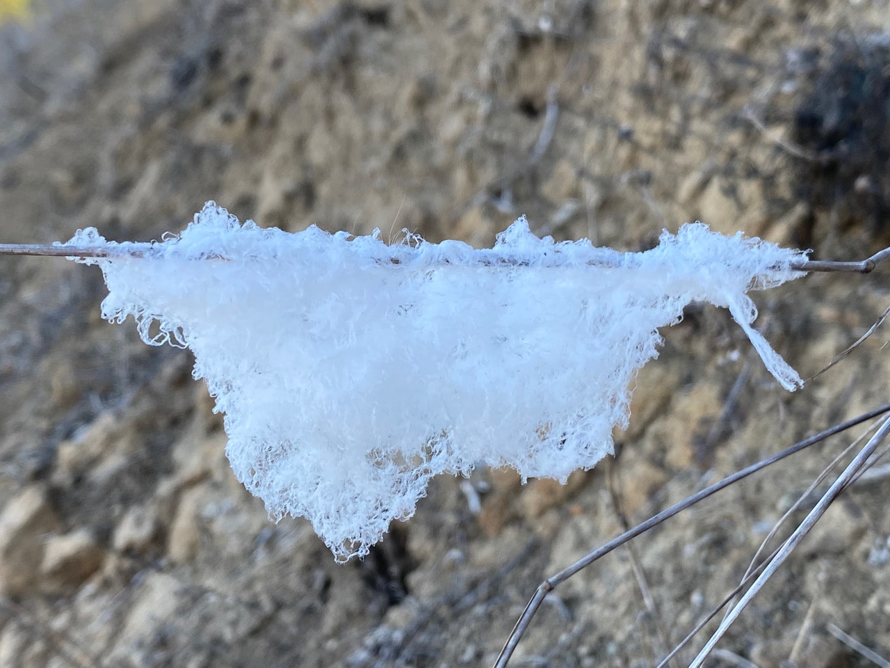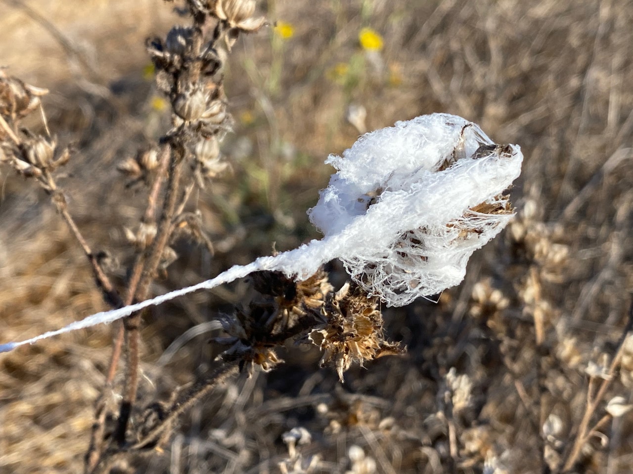 I come across several of these white, fluffy clumps stretched over the dried vegetation in the field.