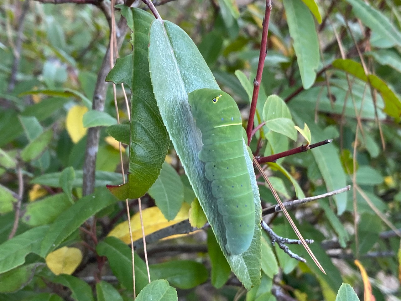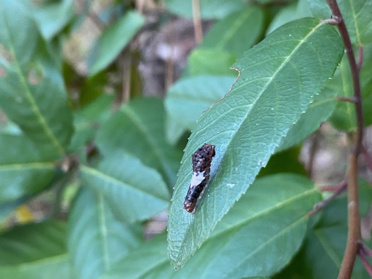 Then I spot something on a leaf that I didn’t see last time – a young Pale Swallowtail caterpillar still in its bird-poop mimicking instar! Wow, will it have enough time to develop before winter sets in? I observed Blue for six weeks from this stage to the time it disappeared to pupate. Assuming that development is fairly uniform across the species, this little caterpillar will need another 6 weeks to complete its larval development. The current warm trend in our weather bodes well for it.