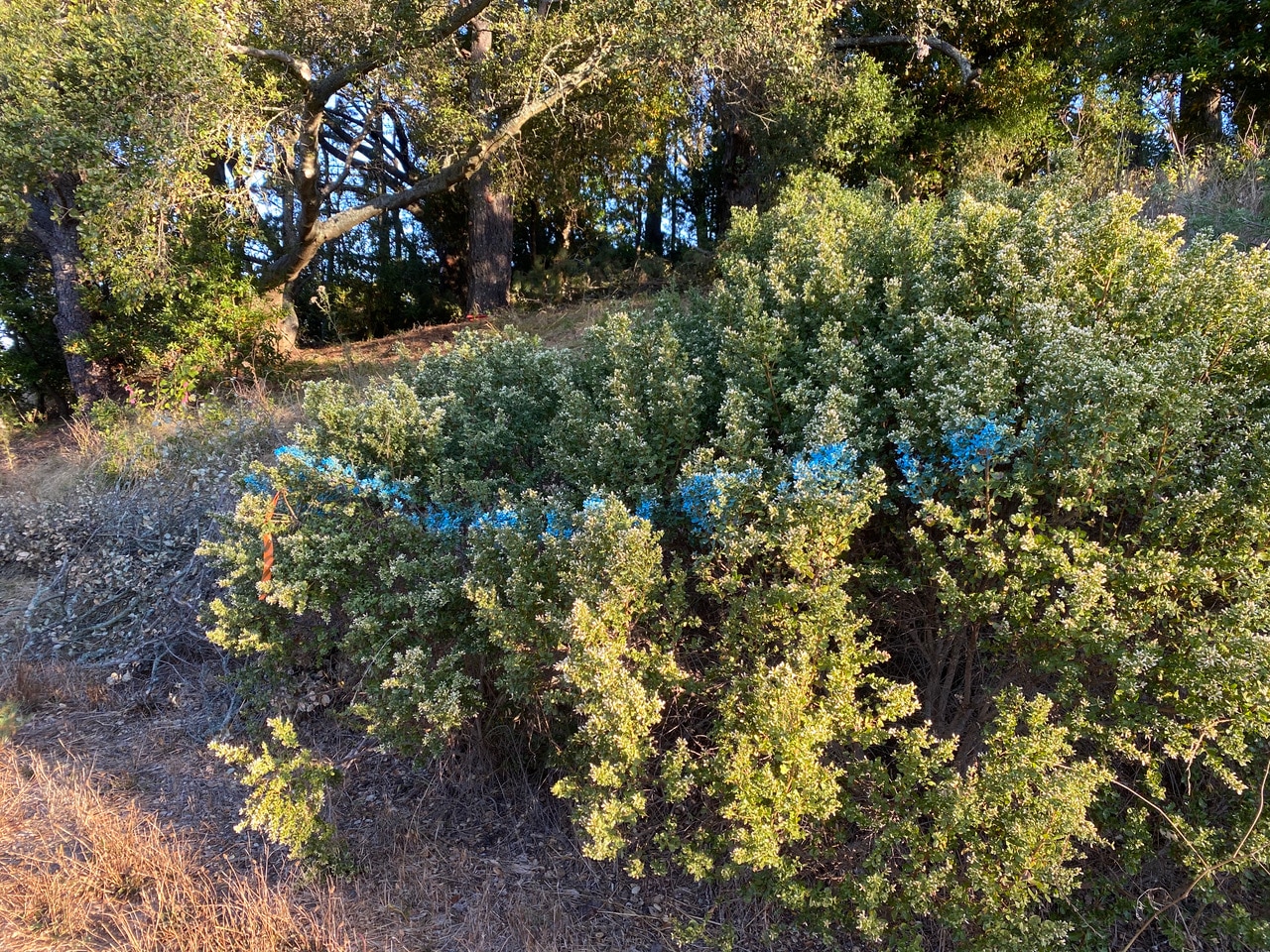 I love the open vistas at Inspiration Point in the Berkeley hills, but invariably my attention is drawn to the human impacts on the landscape. Why has this large Coyote Brush, Baccharis pilularis next to the trail been sprayed with bright blue paint? Has it been marked to be removed or to be spared from brush clearing?