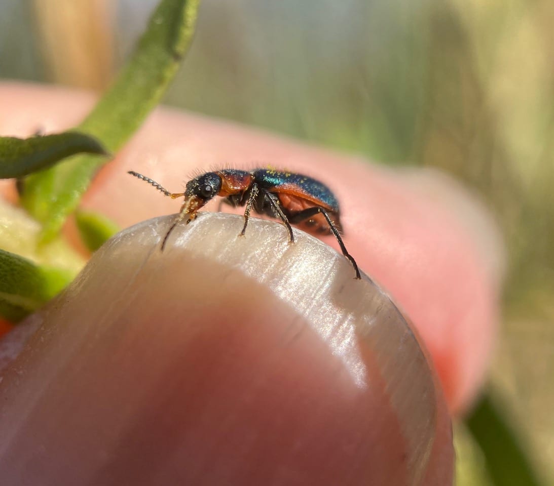 The beetle calmly climbs onto my finger while I grip the stem beneath the flowerhead. It is clearly a female.