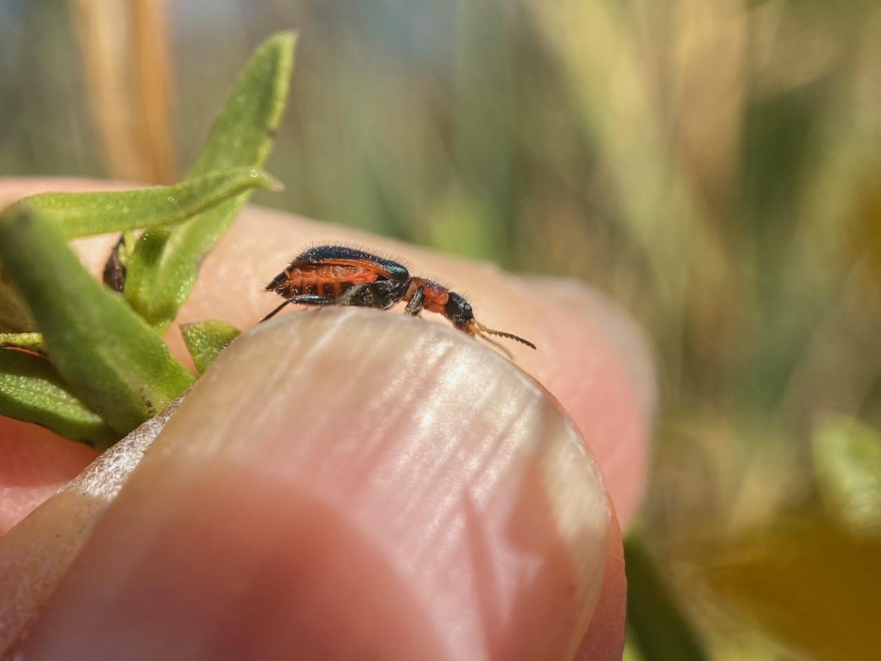 Here’s a good view of the female Collops’ antennae. The beetle is on the edge of my thumb nail. She lacks the knobby structure near the base of the antennae that are conspicuous in the males.