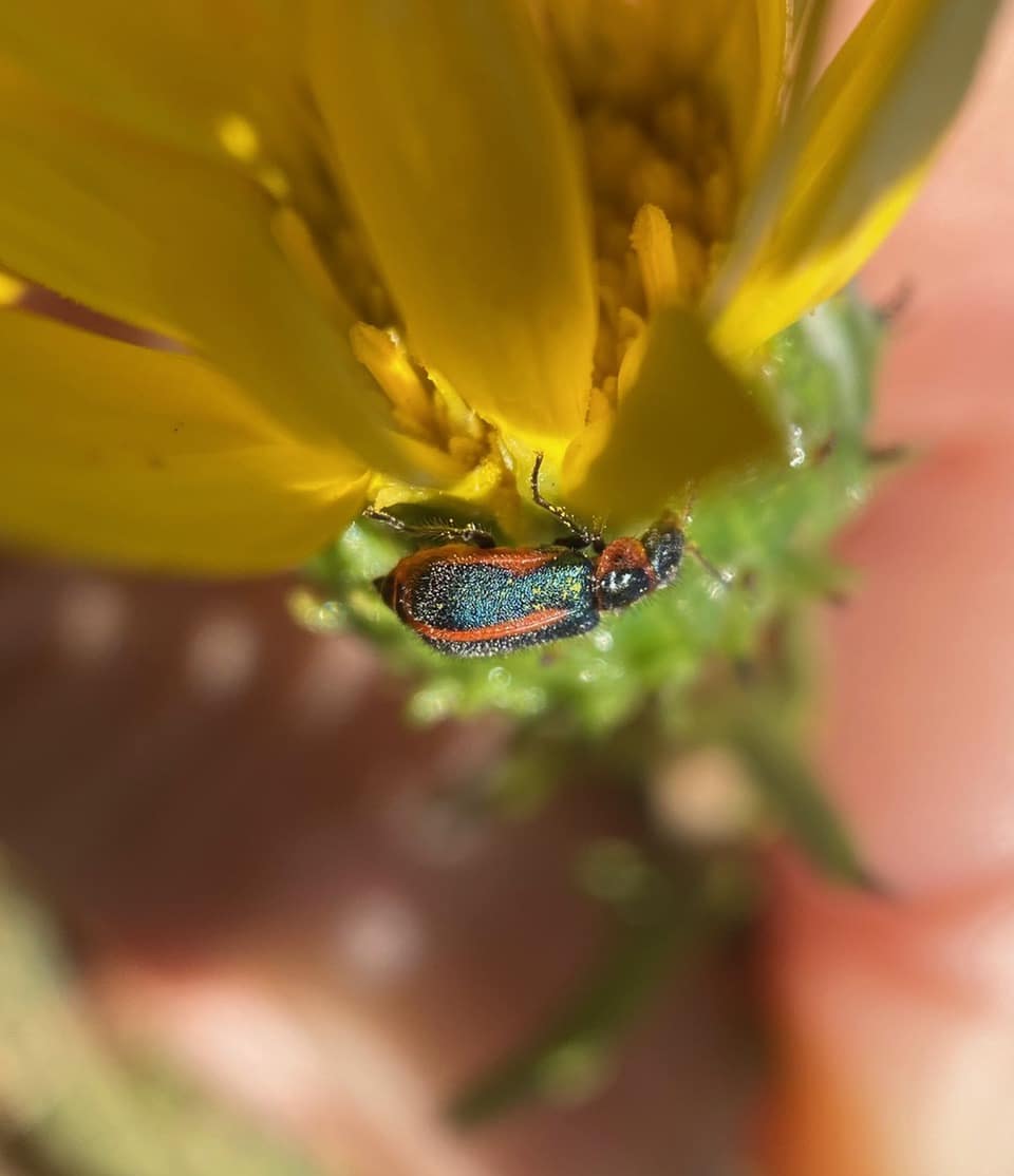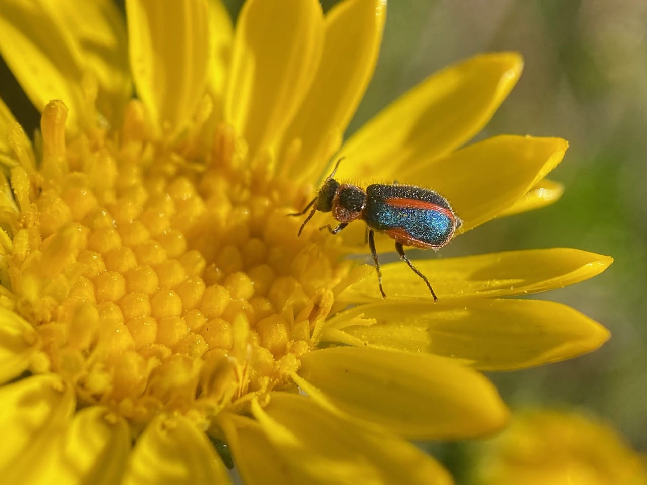 A Soft-winged Flower Beetle, Collops sp. (family Melyridae) provides colorful contrast on a fresh Grindelia flowerhead.