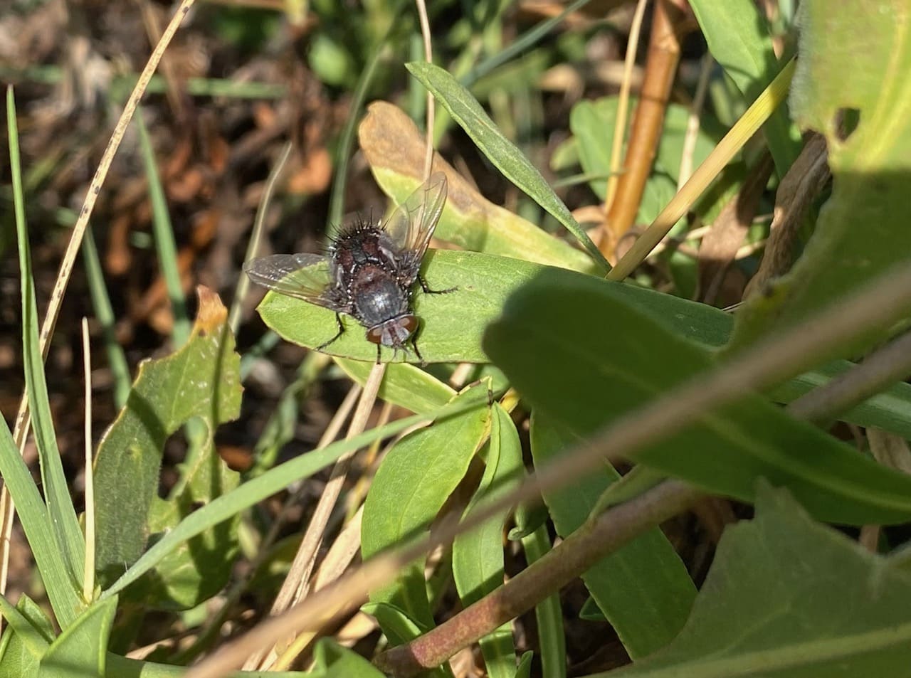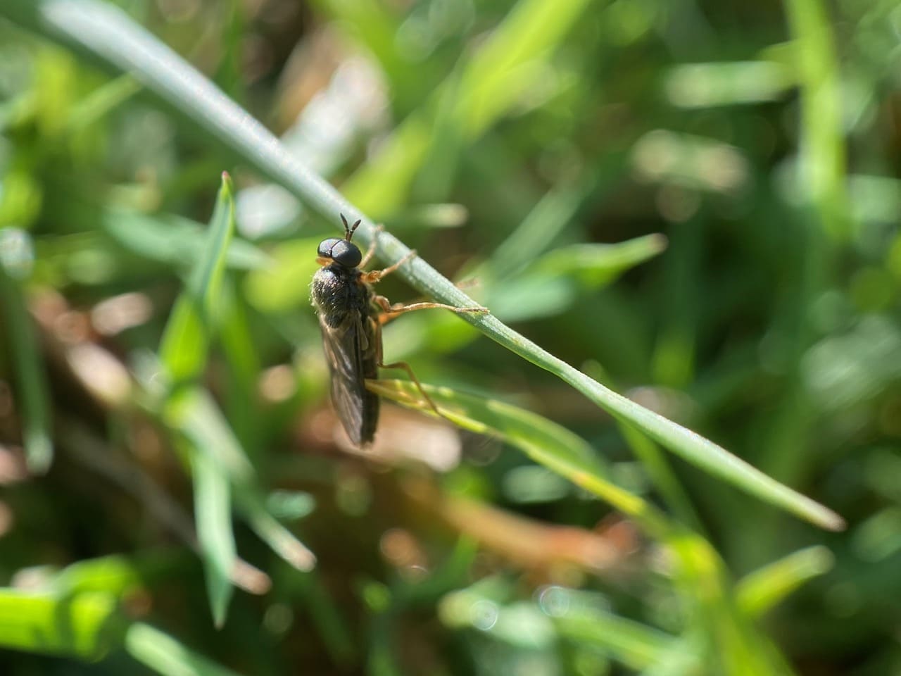 Numerous small insects are dancing low over the green, well-watered lawn. They are skittish and difficult to photograph. Finally one perches on a blade of grass to groom itself. Wow, it is all eyes! iNaturalist has helped identify it as the Sugarcane Soldier Fly, Inopus rubriceps (family Stratiomyidae). I have actually seen the females at this location – they didn’t look like this at all. What we have here is obviously a male.