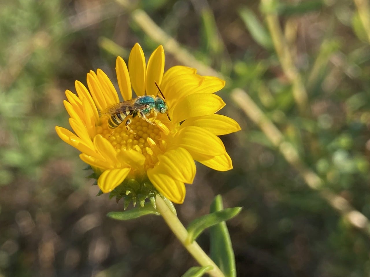 A male Texas Striped Sweat Bee, Agapostemon texanus (family Halictidae) visits a Grindelia flowerhead for nectar. These bees seem to be the predominant bees on the Grindelia now that the number of the Summer Longhorn Bees, Melissodes sp. (family Apidae) has declined sharply. I only encounter one or two Melissodes today.