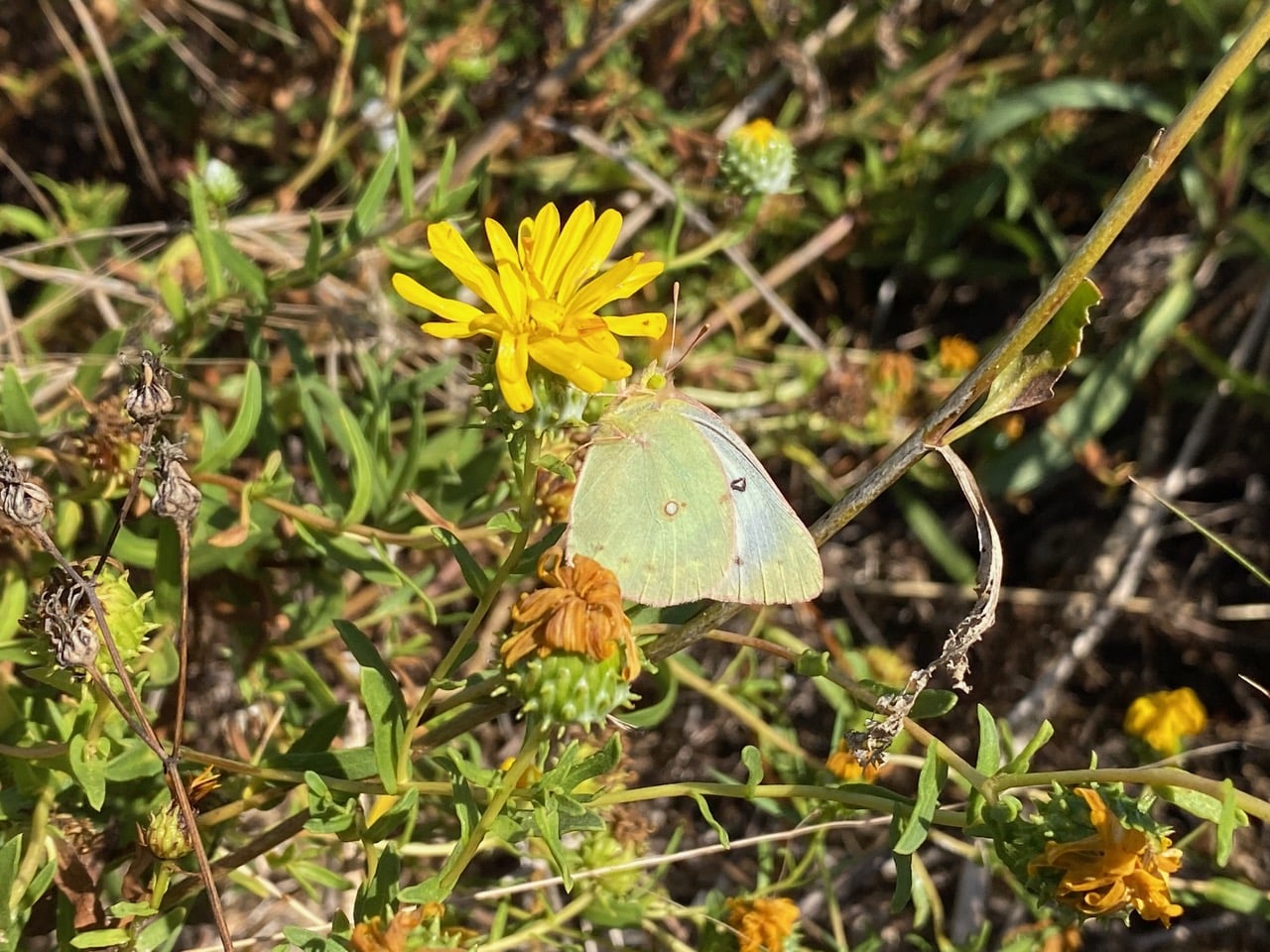 An Orange Sulphur butterfly is clinging motionless to the side of a Grindelia flowerhead, but does not seem to be taking nectar.