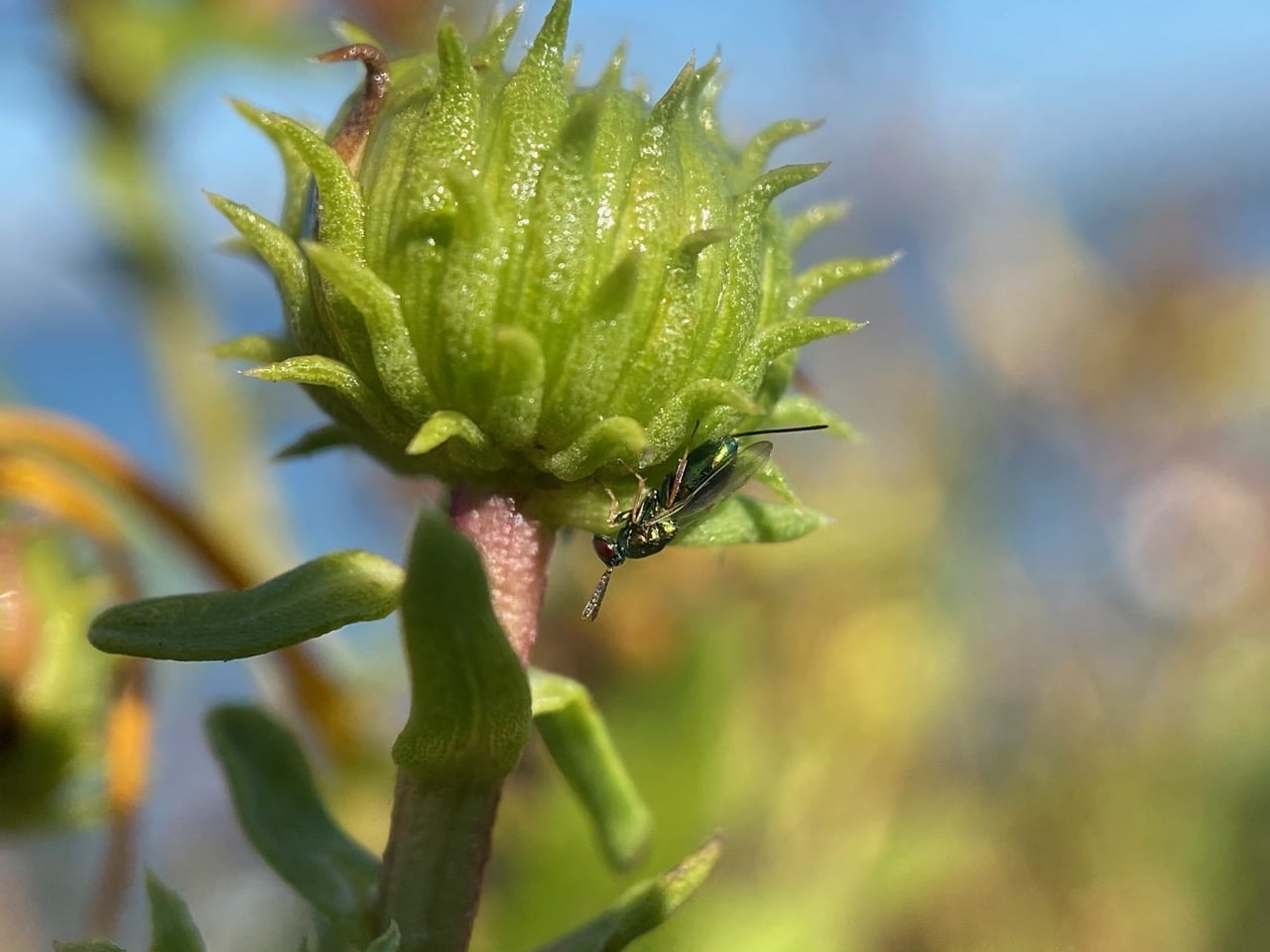 Her job done, the wasp turns around, climbs up the involucre and flies away. iNaturalist has identified it as a chalcid wasp, Torymus sp. (family Torymidae).