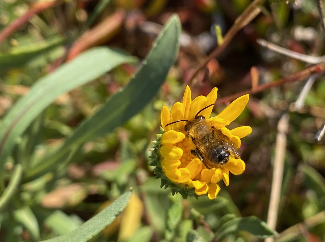 A male Western Leafcutter Bee, Megachile perihirta (family Megachilidae) is perched motionless on a freshly opened Grindelia flowerhead. Is it asleep or is it dead? It looks like a healthy bee. I mark the plant so I can return to check on the bee later on. When I pass this way about half an hour later, the bee is no longer there. It was merely taking a nap.