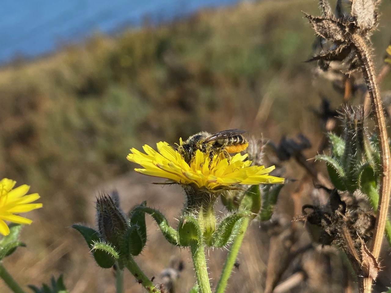 A female Texas Striped Sweat Bee, Agapostemon texanus (family Halictidae) is foraging on a flowerhead of Bristly Oxtongue, Helminthotheca echioides.