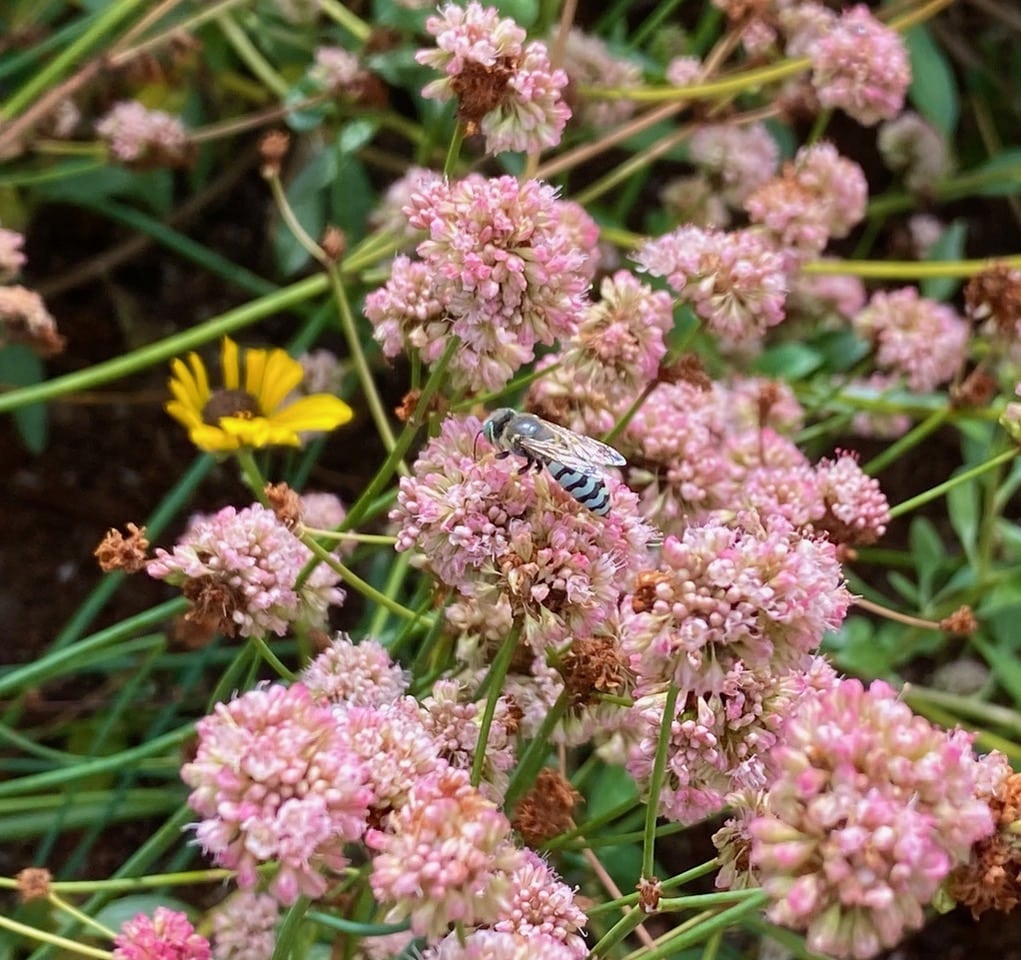 An American Sand Wasp, Bembix americana (family Crabronidae) is foraging on a cluster of pink-flowered Buckwheat, Eriogonum sp.