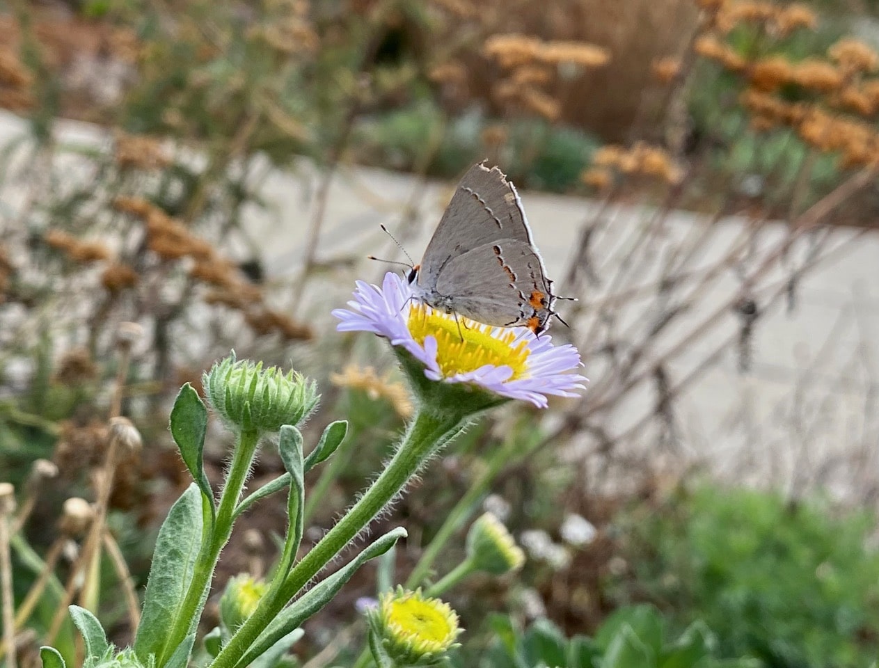 A rather ragged looking Gray Hairstreak, Strymon melinus (family Lycaenidae) lands on a Seaside Daisy flowerhead. While the butterfly probes for nectar, it constantly rubs its hind wings together.