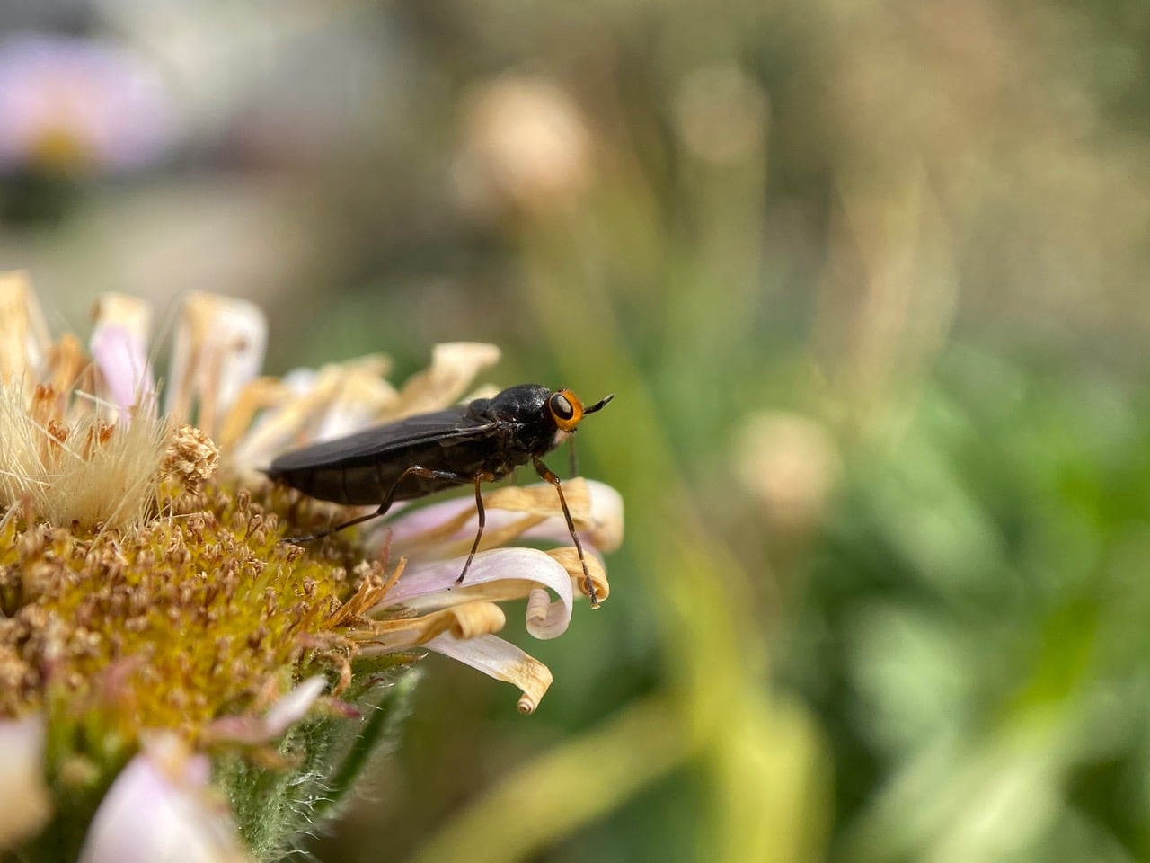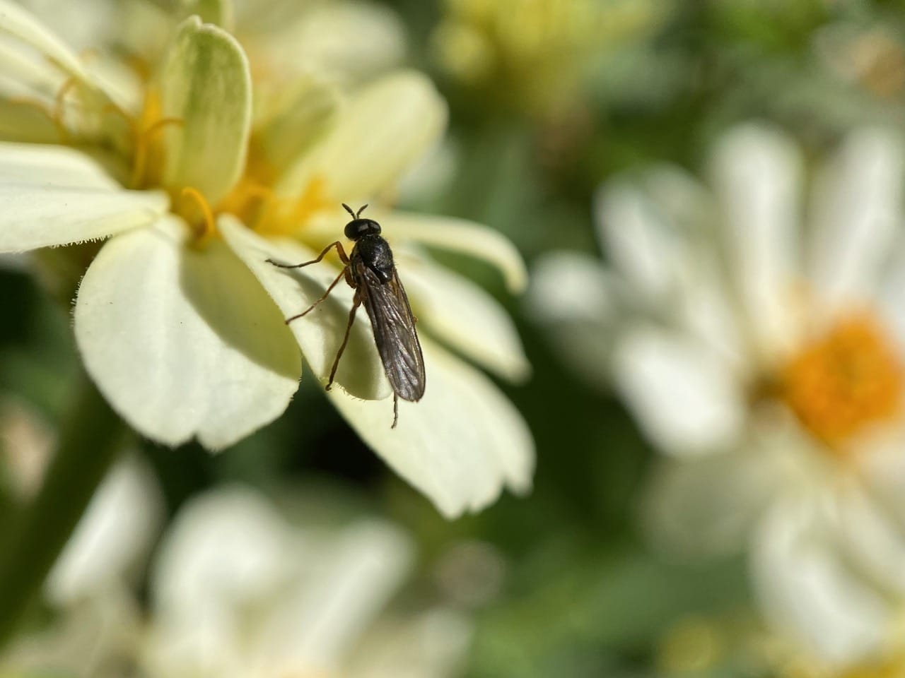 Syritta pipiens originates from Europe and is currently distributed across Eurasia and North America. They are fast and nimble fliers. The fly is about 6.5 – 9 mm long. The species flies at a very low height, rarely more than 1 m above the ground. Adults visit flowers – males primarily to feed on nectar, and females to feed on protein-rich pollen to produce eggs. The species is found wherever there are flowers. It is also anthropophilic, occurring in farmland, suburban gardens, and urban parks. Larvae are found in wetlands that are close to bodies of freshwater such as lakes, ponds, rivers, ditches. Larvae feed on decaying organic matter such as garden compost and manure. Males often track females in flight, ending with a sharp dart towards them after they have settled, aiming to attempt forced copulation.
