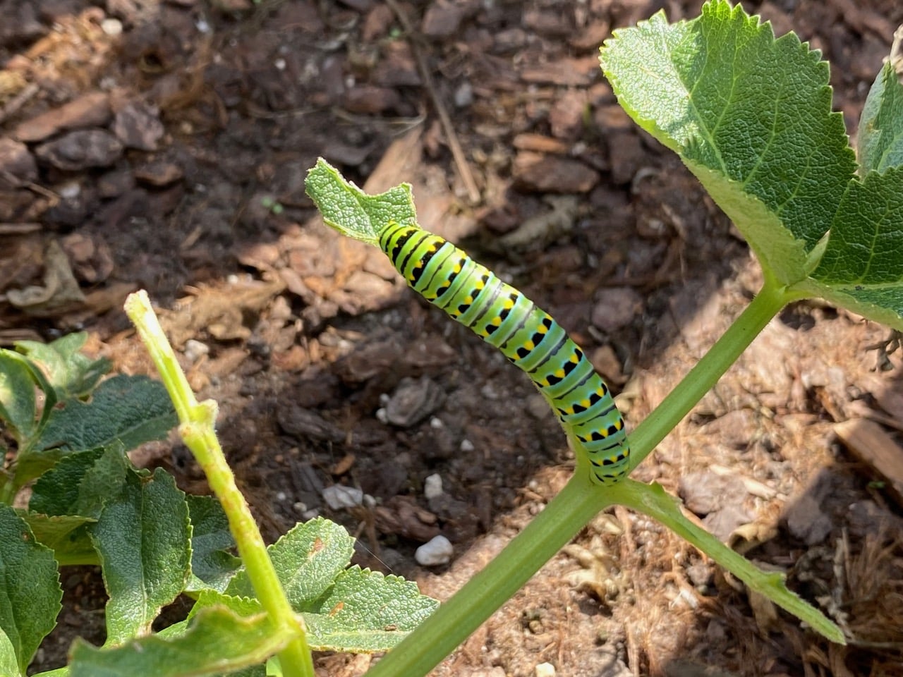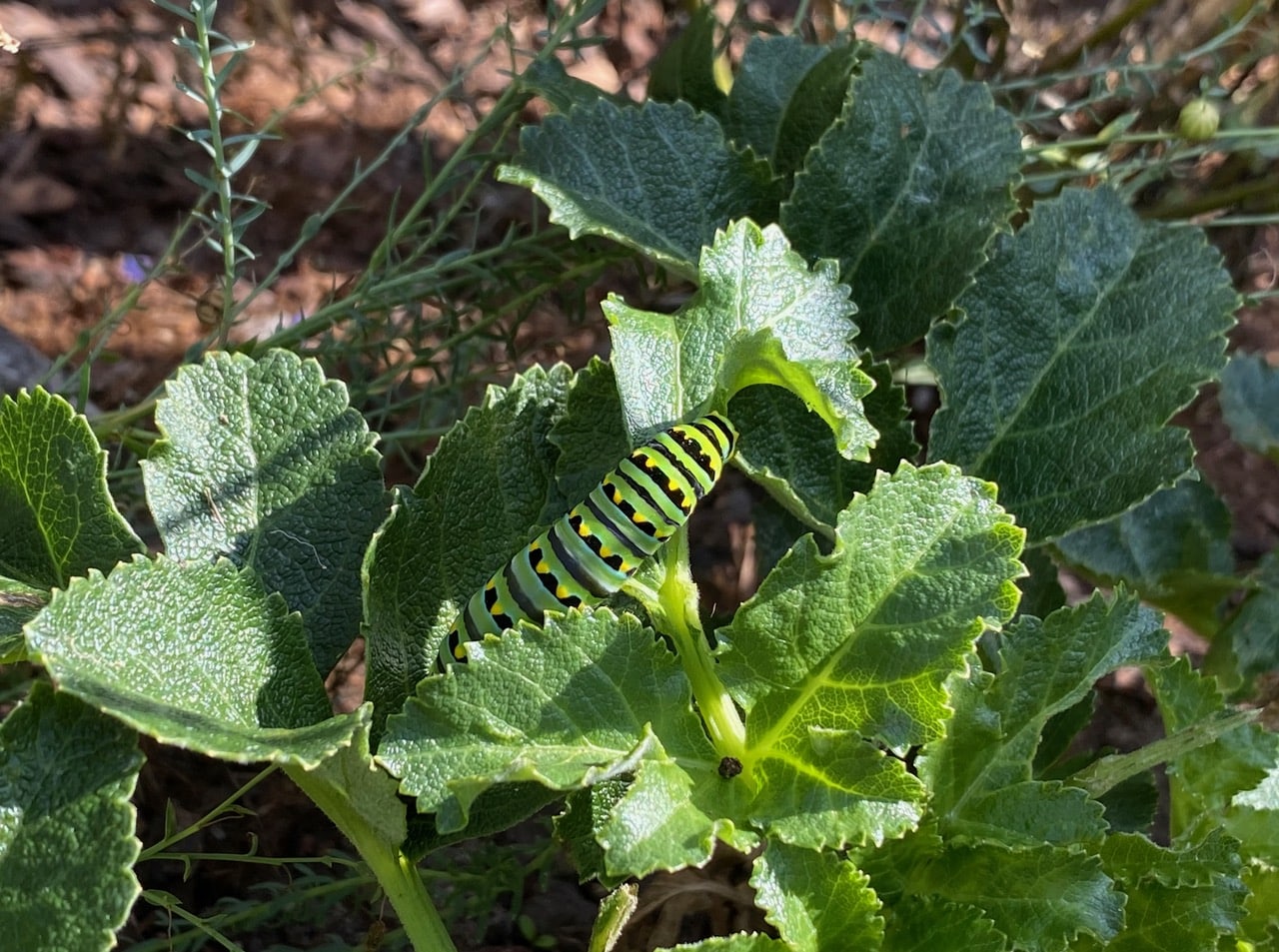 This Anise Swallowtail caterpillar is feeding on another leaf of the same plant. Note that several of the leaflets have been demolished. Both caterpillars look like they are close to pupation. There’s actually a third caterpillar hidden in the foliage of the same plant.