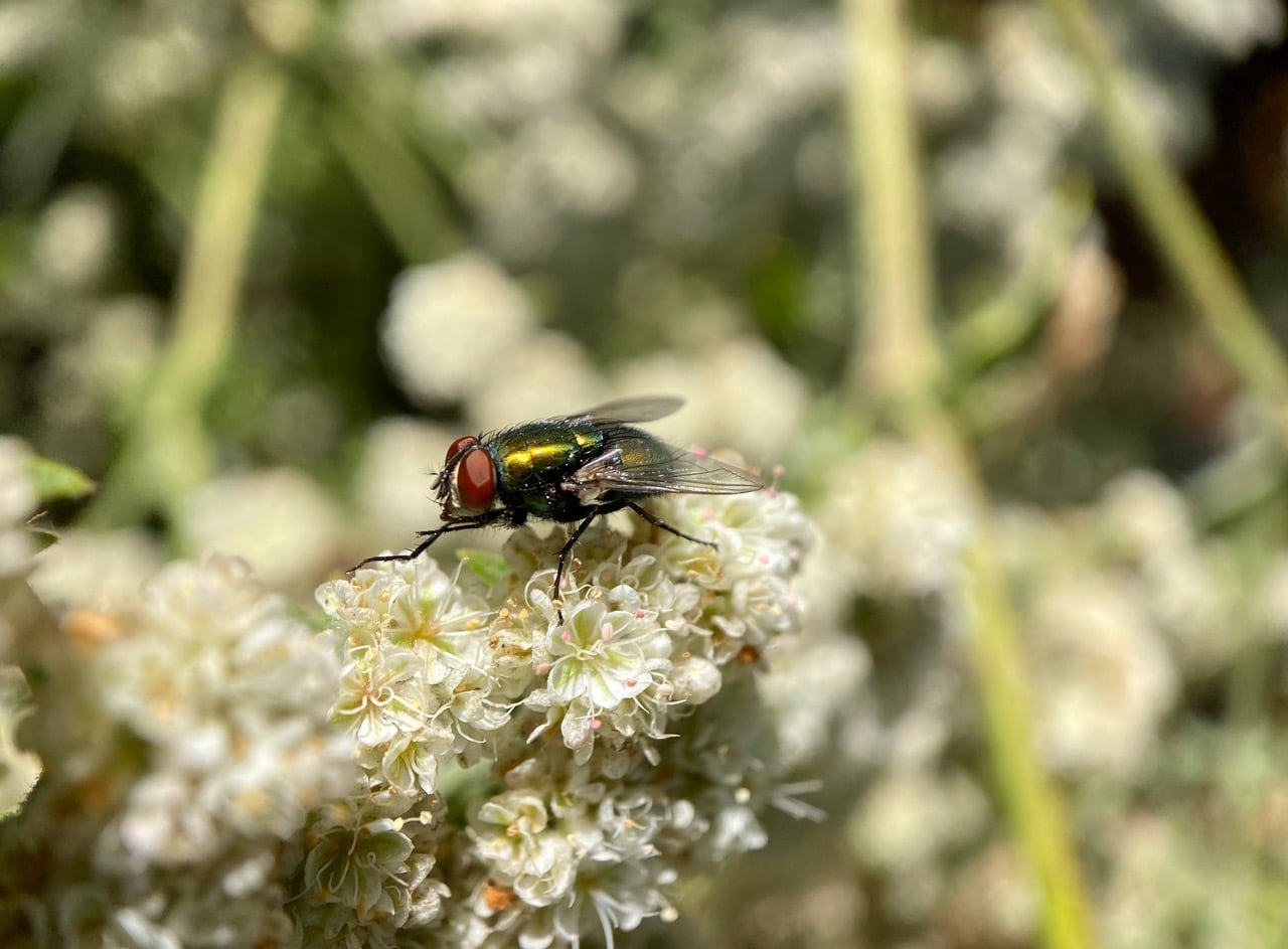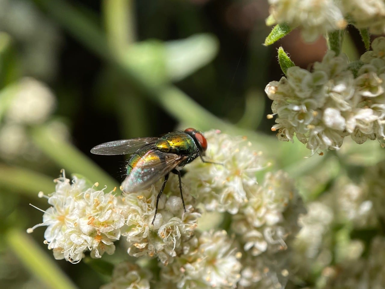 A Common European Greenbottle Fly, Lucilia sericata (family Calliphoridae) is grooming itself on an inflorescence of St. Catherine’s Lace, Eriogonum giganteum.