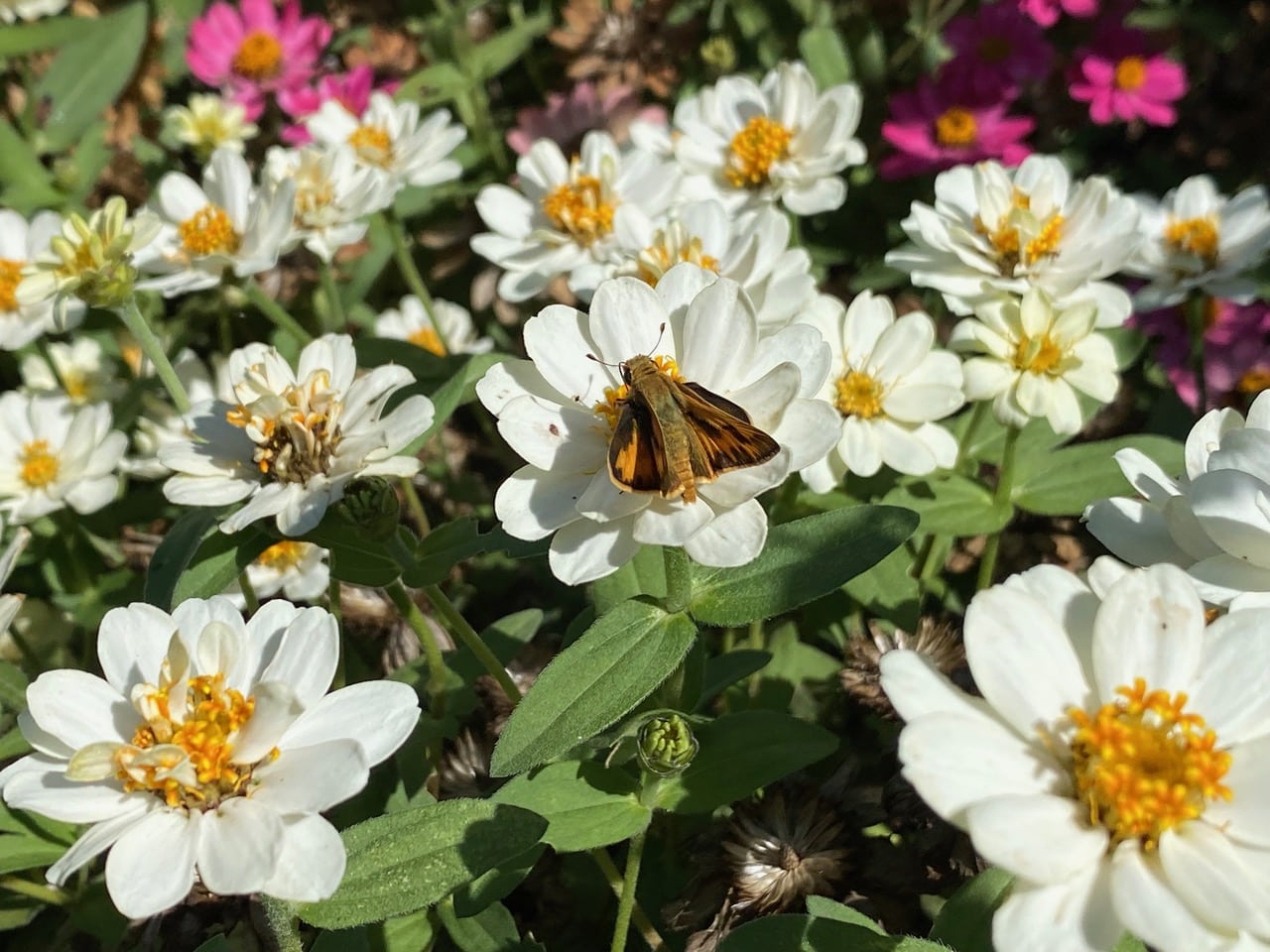 A Fiery Skipper, Hylephila phyleus (family Hesperiidae) is taking nectar on a Zinnia flowerhead.