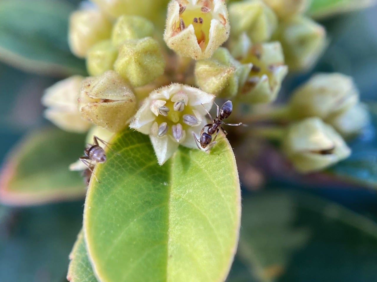 Argentine Ants are swarming over the Coffeeberry flowers, seeking nectar.