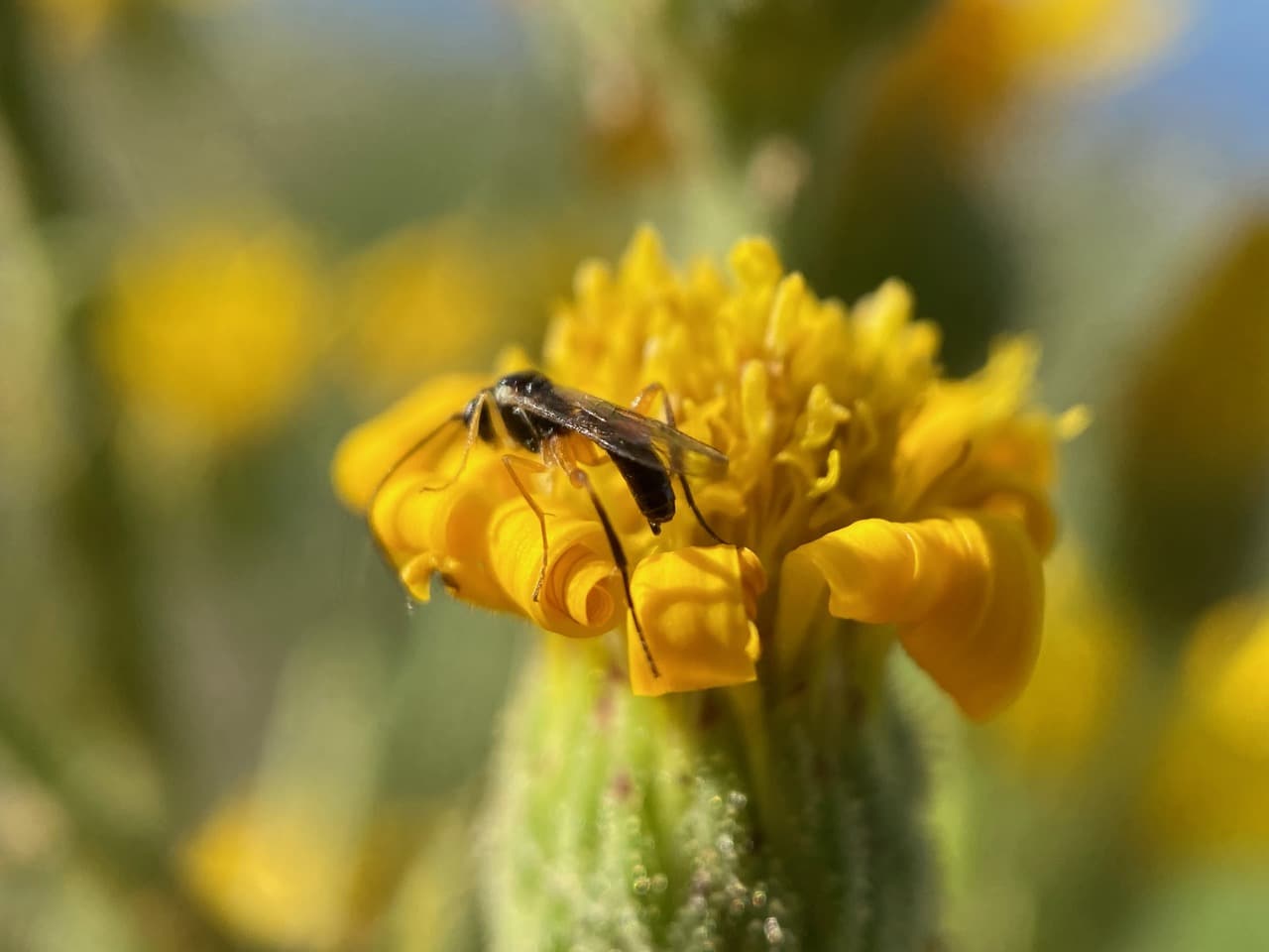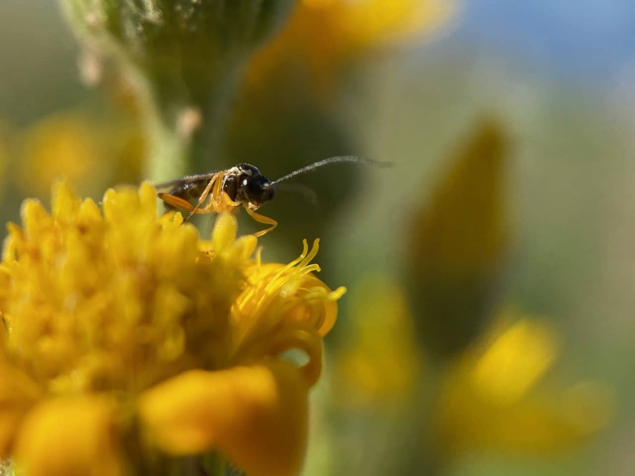 A small wasp with very long antennae appears on a fading Telegraph Weed flowerhead. A parasitic wasp in the superfamily Ichneumonoidea?