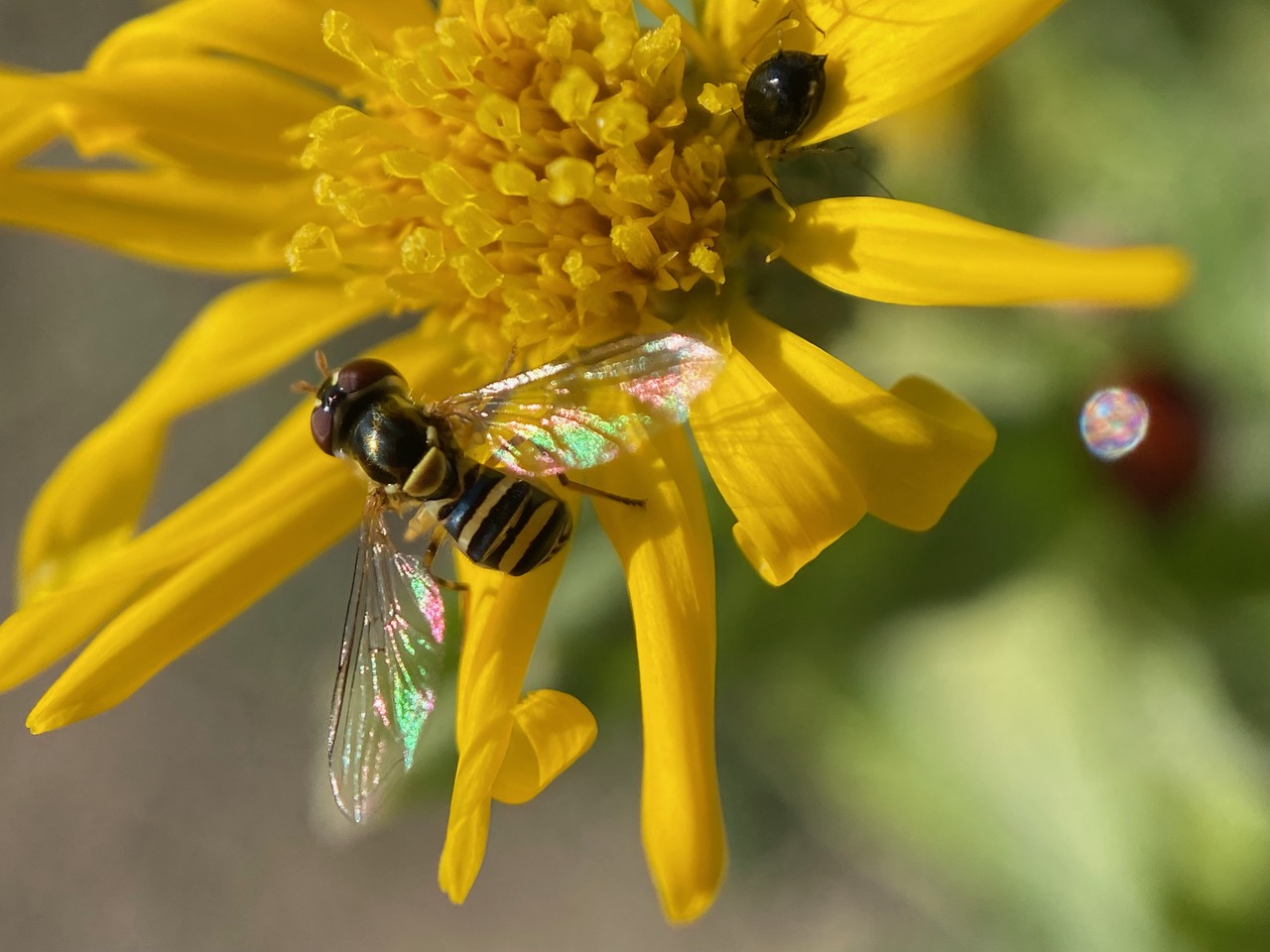 Wow, in less than 30 minutes, I have unraveled a mini ecosystem centered around the aphids on a single Telegraph Weed. The lady beetle is here to feed on the aphids. Some of the aphids have been parasitized by wasps that turned them into “mummies”. The female hover fly is here to lay her eggs close to the aphids. The hover fly larva is an aphid predator. The parasitoid wasp is here to lay her eggs in the eggs or larvae of the hover fly. Who would’ve thought so much is going on right under our noses! Aphids tend to generate this kind of complex interactions among their friends and foes, visible to any curious gardener who cares to look through a magnifying glass.