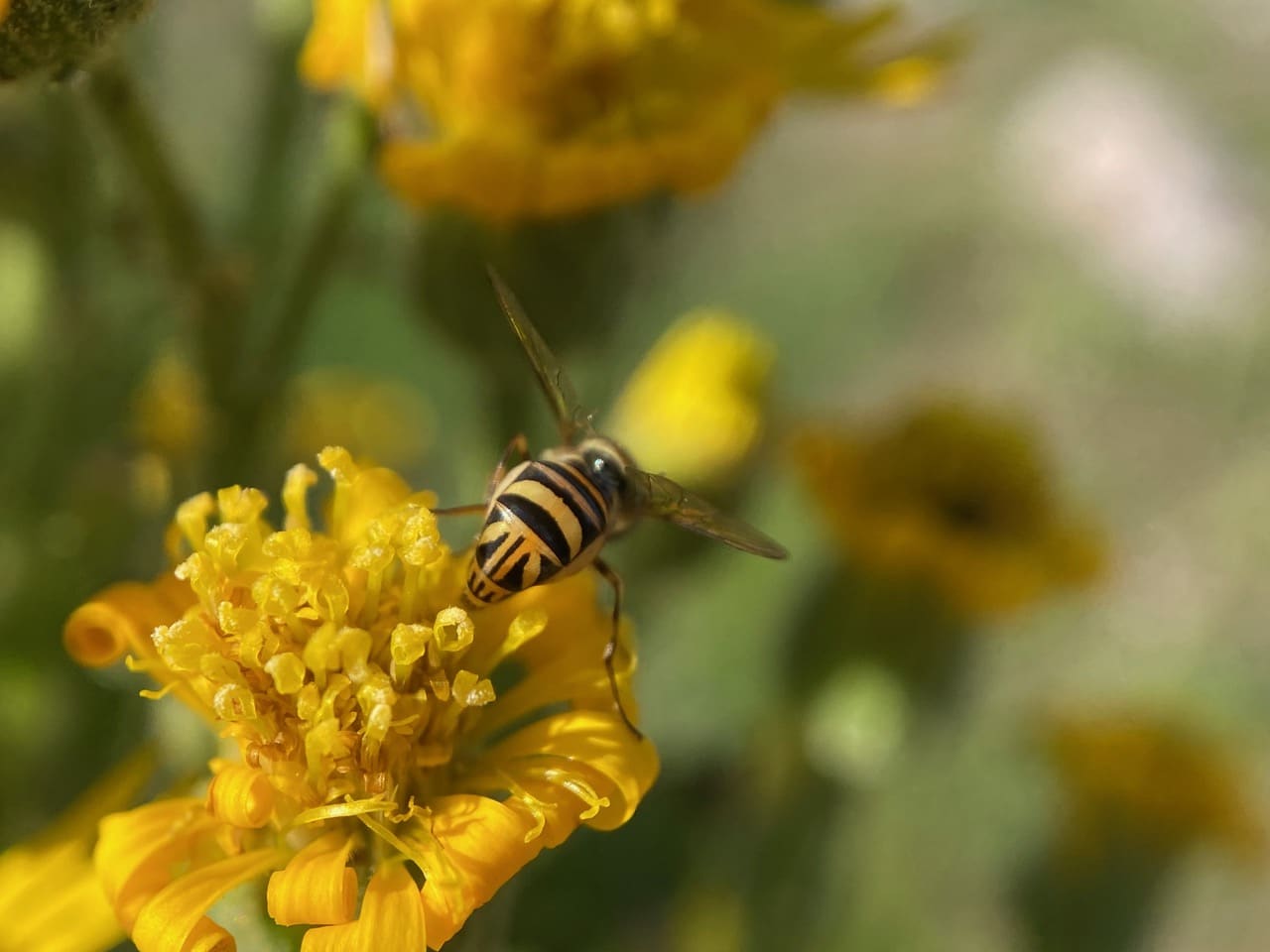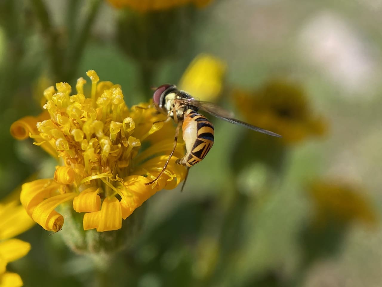 A female Oblique Streaktail, Allograpta obliqua (family Syrphidae) has landed on a fading Telegraph Weed flowerhead. The gravid hover fly has the pointed tip of her abdomen fully extended as if she’s in egg laying mode.