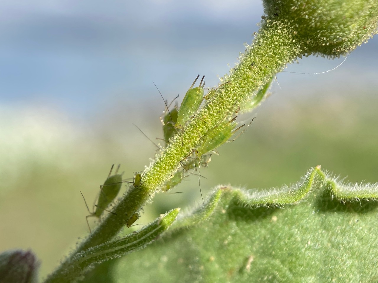 The presence of both the hover fly larva and the lady beetle are suggestive of the presence of aphids on the plant. It didn’t take long for me to find them. iNaturalist has helped identify them as members of the genus Macrosiphum (family Aphididae).