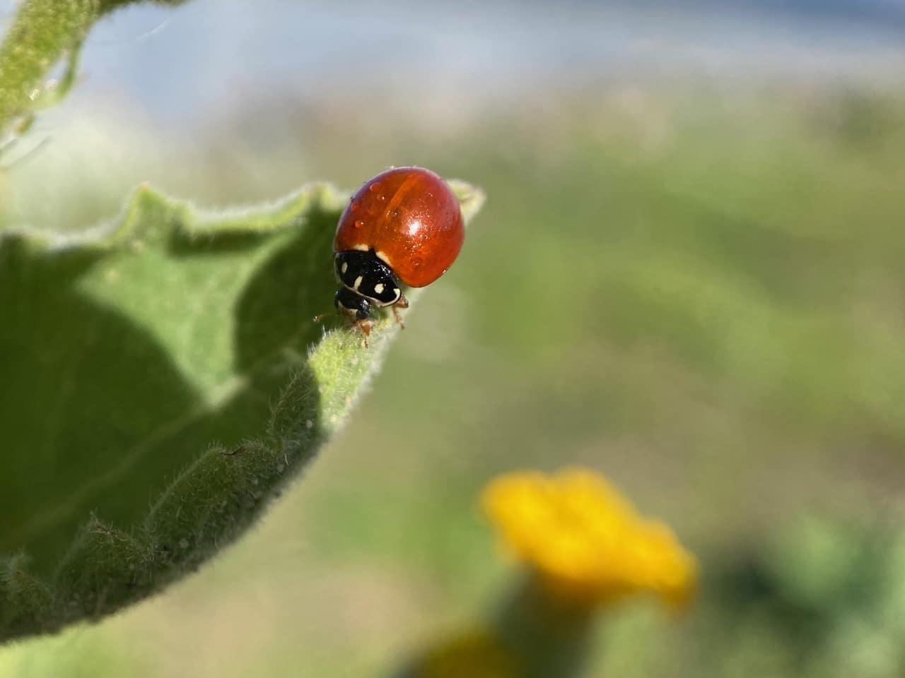 A Spotless Lady Beetle, Cycloneda sanguinea (family Coccinellidae) is resting on a leaf of Telegraph Weed, droplets of moisture clinging to its elytra. Those don’t look like rain drops. Maybe accumulations of aphid honeydew?