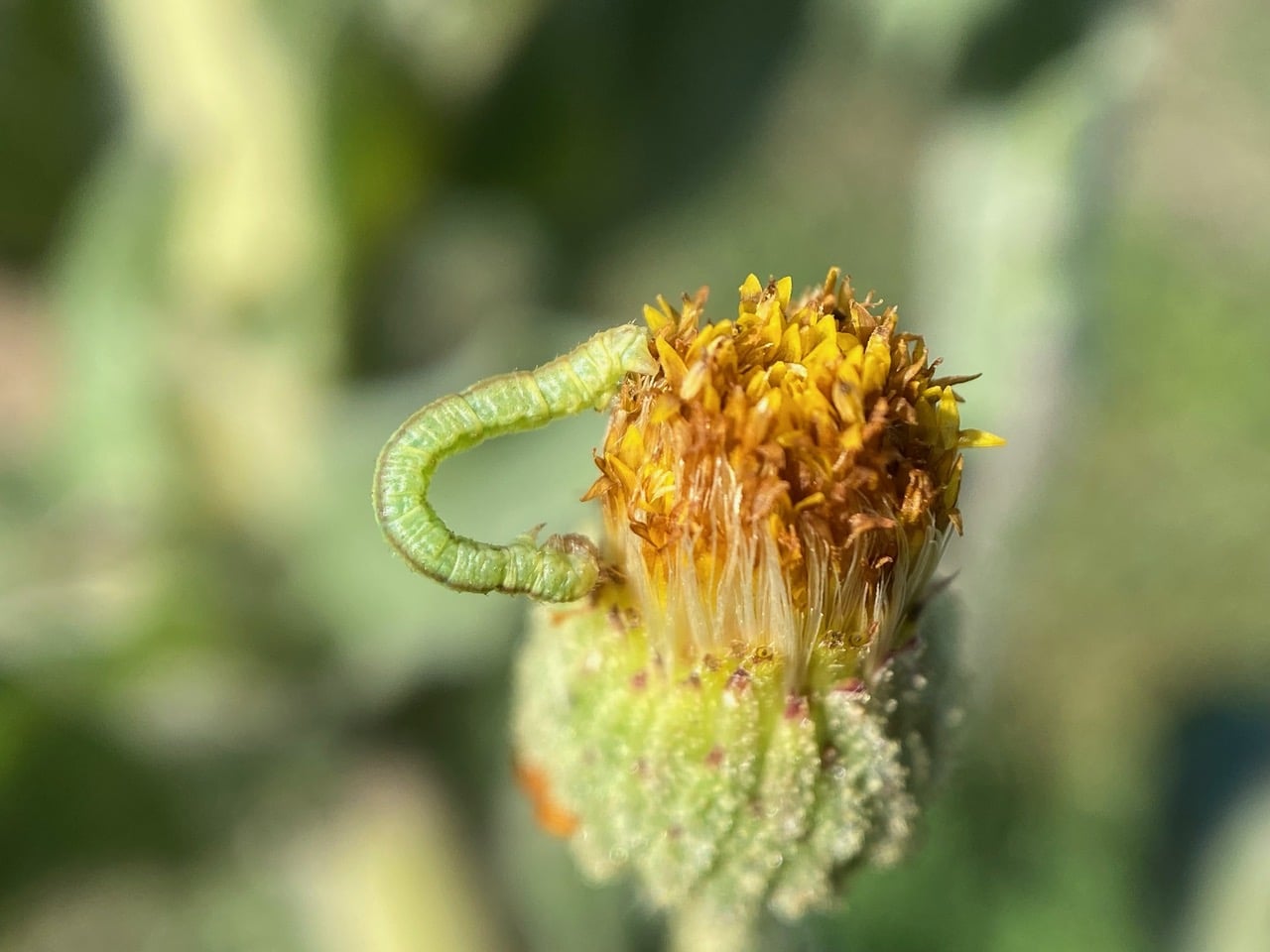 Look, here’s a caterpillar on a spent Telegraph Weed flowerhead! It is an Inchworm, larva of a Pug Moth in the genus Eupithecia (family Geometridae).