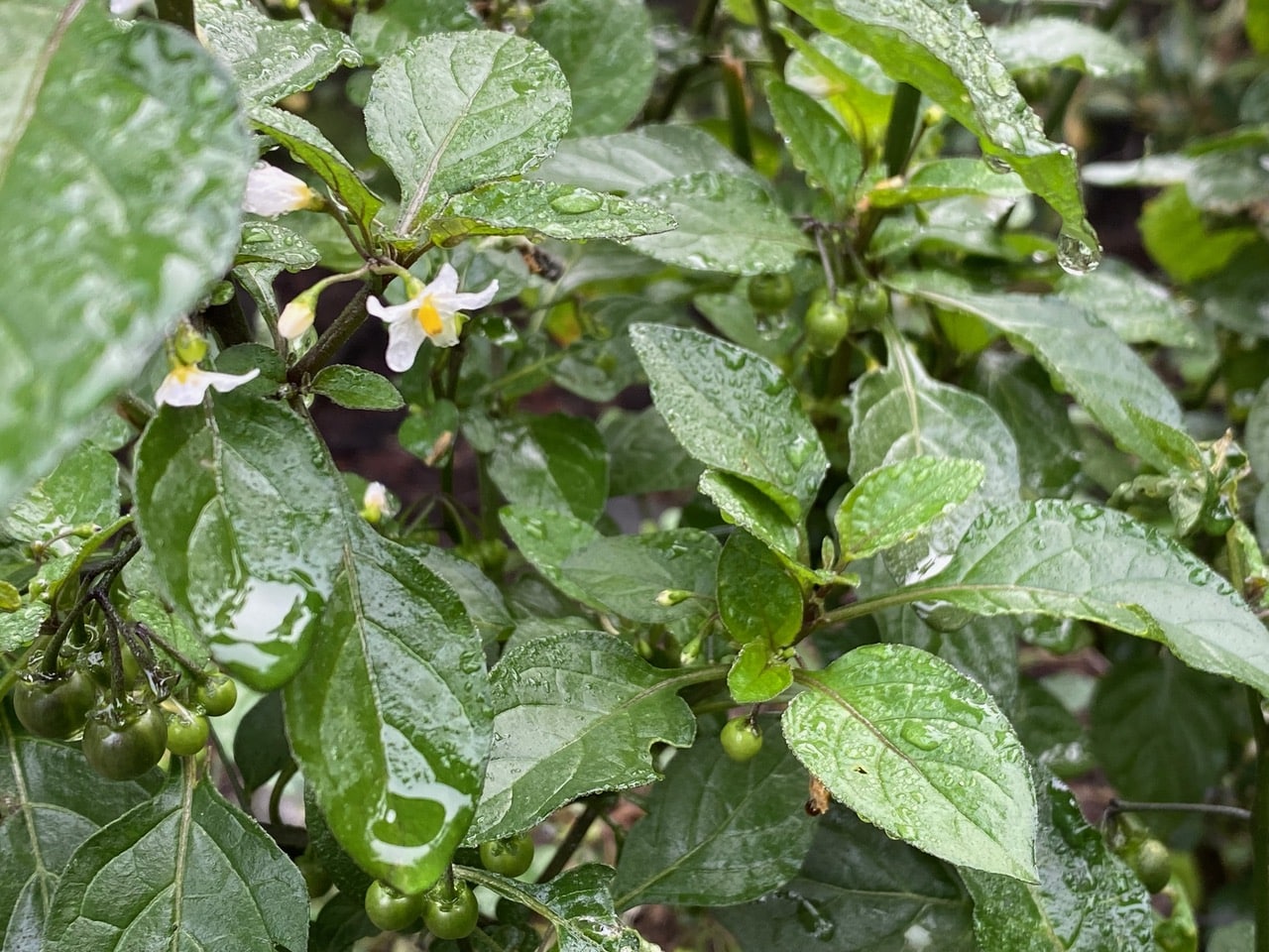 Near the gate of the FOSC Native Plant Nursery, the American Black Nightshade, Solanum americanum is drenched in rain.