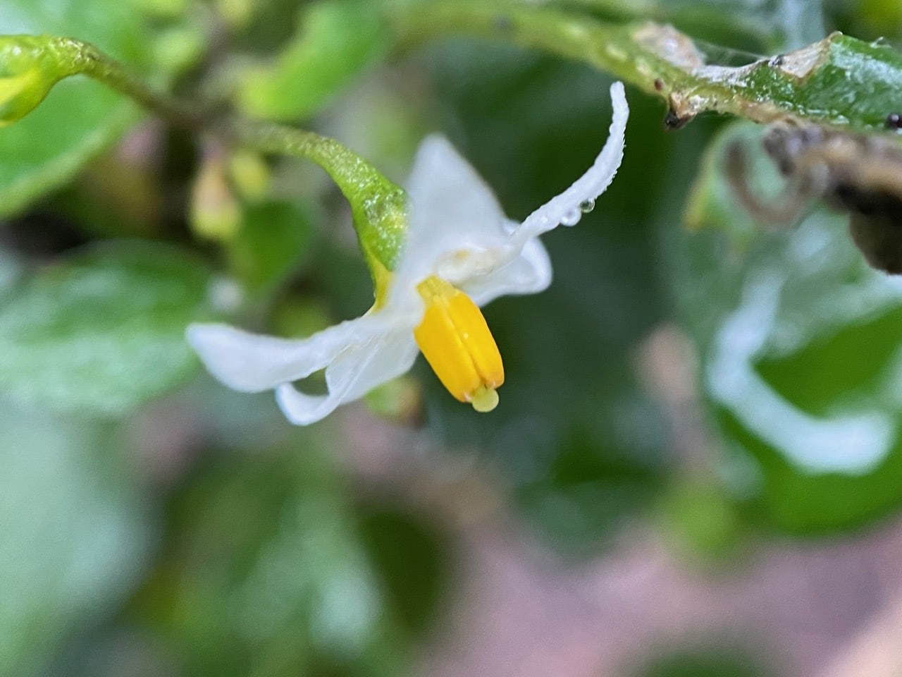 The small pendant flowers of the nightshade have protected their reproductive parts nicely. The flaring petals prevent the direct onslaught of the rain, while the pollen is safely hidden in the elongate anthers that form an anther tube surrounding the style and stigma. Pollination of these flowers requires the special skill of certain bees to sonicate or vibrate the anthers to release the pollen through the terminal pores. I have not thought of these floral features as adaptations for weather proofing.