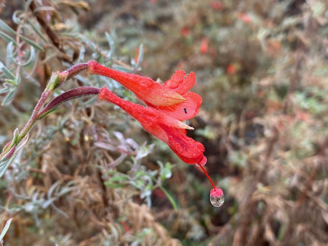 Many of the California Fuchsia, Epilobium canum have closed their flowers in response to the rain. Somehow I have never noticed this behavior before. These flowers generally do not close in the evening; they remain open continuously during their blooming season to attract pollinators. The closed petals wrap around the stamens to protect the pollen from the rain, while the longer style and stigma remain exposed, dripping with rain drops. It makes sense that flowers that bloom during our wet season are downward facing. Think of manzanita, pink-flowering currants, milk maids…