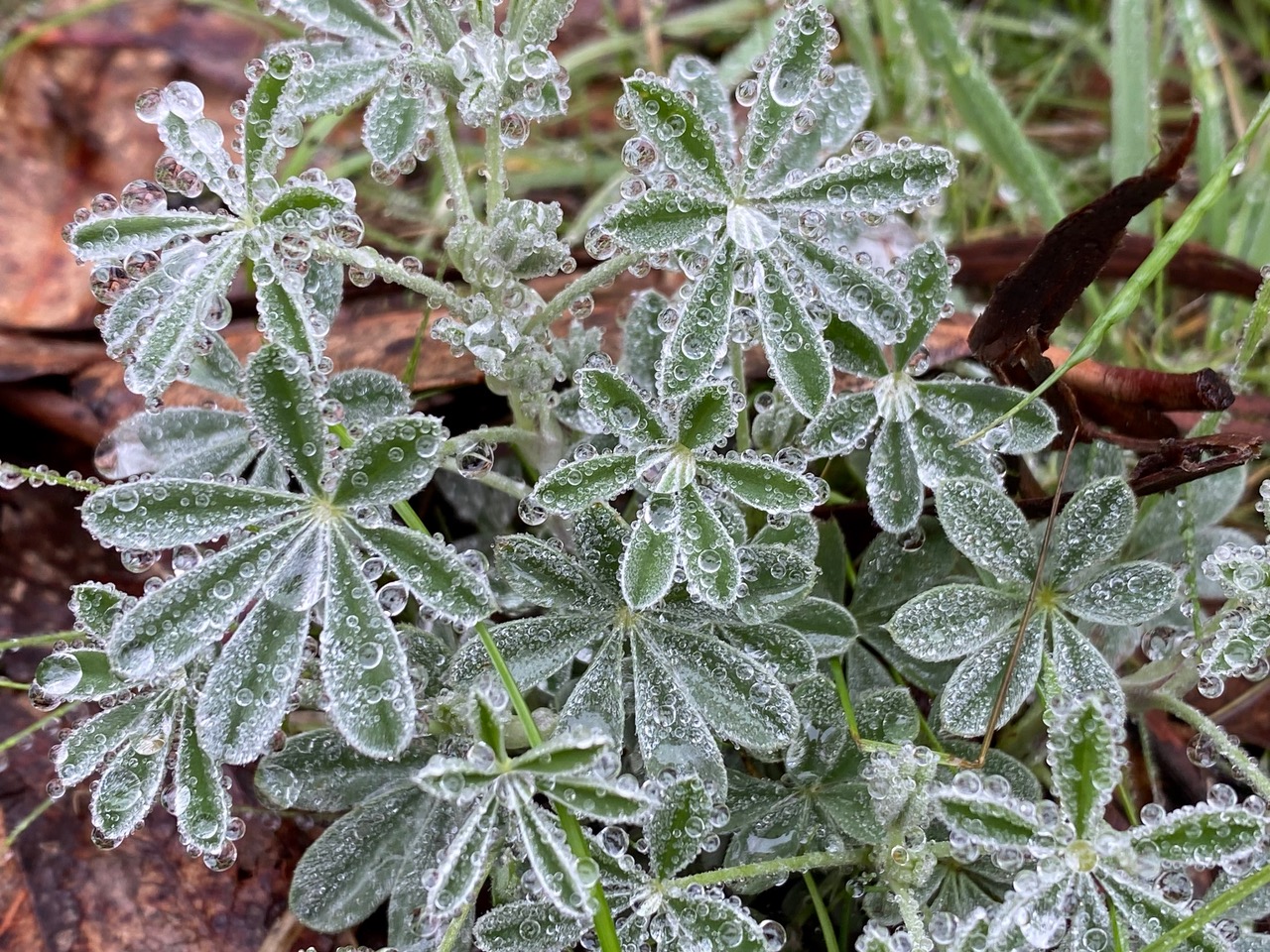 The Silverleaf Lupine, Lupinus albifrons is a work of art, glistening with rain drops that have been trapped by the hairs on the leaves. The leaf hairs are supposed to reflect sunlight, reducing heat and UV radiation, protecting the leaf. They are also thought to trap a layer of still air, reducing evaporation and water loss.