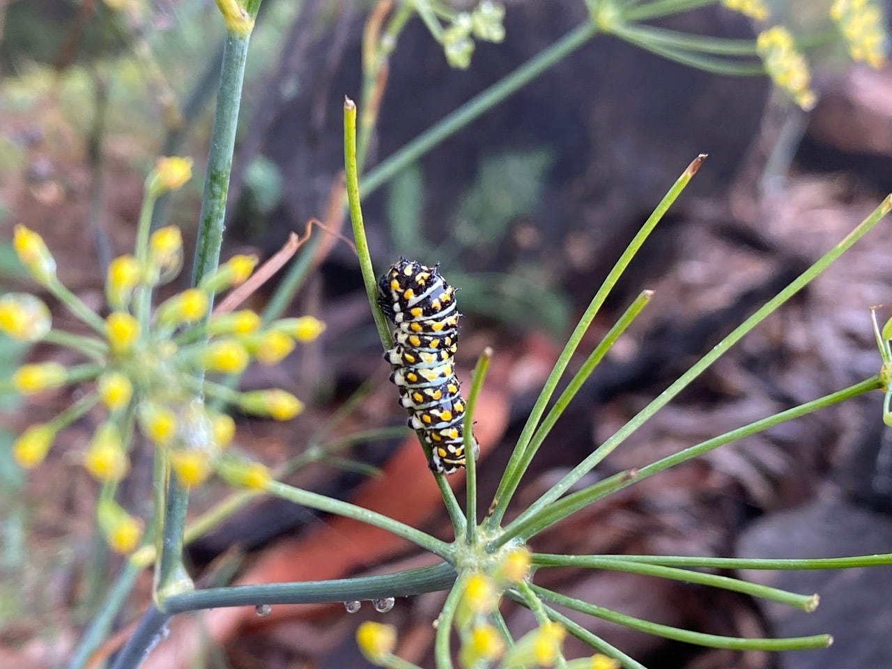 Surprise, that’s an Anise Swallowtail caterpillar on the Fennel, Foeniculum vulgare! Wow, this is the latest in the year I have ever seen a caterpillar of this species. Most should have formed chrysalids by now to wait out the winter. The caterpillar is almost 2 inches long. I wonder if it is developing normally, as most instars this size would be predominantly greenish. Last November, I rescued three mature Anise Swallowtail caterpillars at Bay Farm and reared them at home. One has emerged in the spring and has been released back to the wild. The other two are still chrysalids. Sometimes they take more than a year to emerge as butterflies.