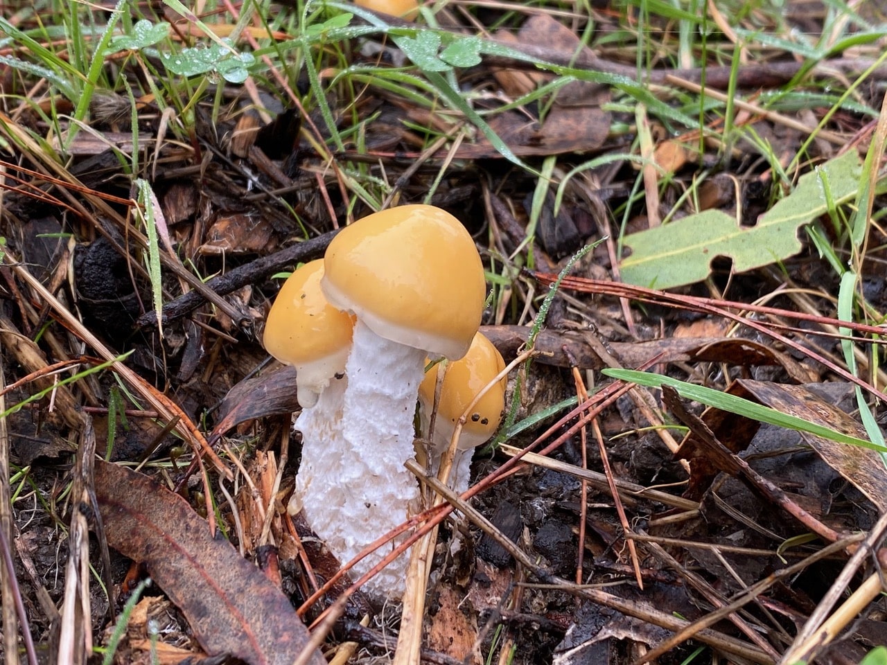 The tall, pale yellow fruiting bodies of Stropharia ambigua are exquisitely beautiful. The pale yellow, sometimes viscid cap with an appendiculate margin and cottony stipe are important field characteristics. The mushrooms are found solitary, scattered to gregarious, usually in deep humus of our coastal forests under conifers, but also found along streams and in damp shaded areas; from late fall to mid winter. It is a saprotrophic agaric mushroom, commonly fruiting in leaf litter and wood chips in the Pacific Northwest. Its edibility is debated.