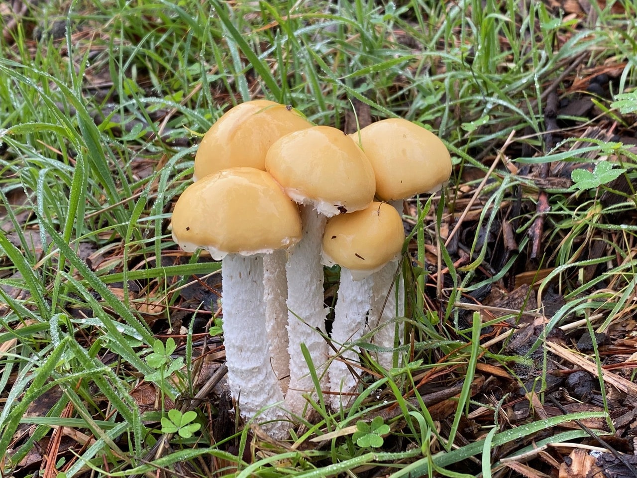 Some yellow mushrooms have popped up on the grassy meadow below the road. Ah, they are Questionable Stropharia, Stropharia ambigua. These are very young, with conic, viscid caps. Note the scaly, cottony stipe.