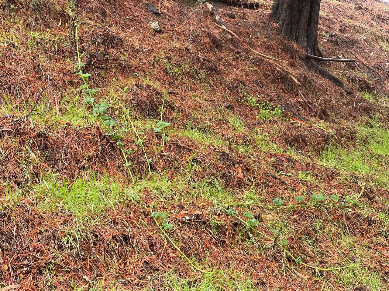 Aha, here’s one of them! The Wild Cucumber or Coastal Manroot, Marah oregana has emerged from the thick duff under the Coast Live Oak and Monterey Pines.