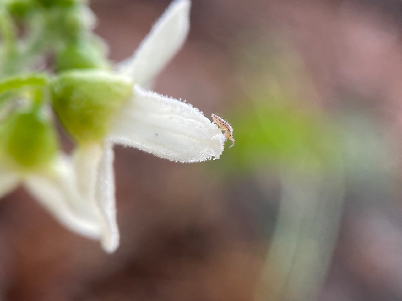 The Wild Cucumber is already in bloom! I take a picture of a cluster of male flowers for the records. Wait, there’s a tiny critter crawling out of that flower.