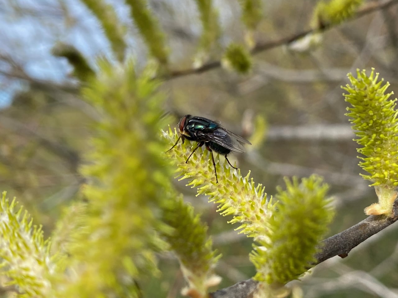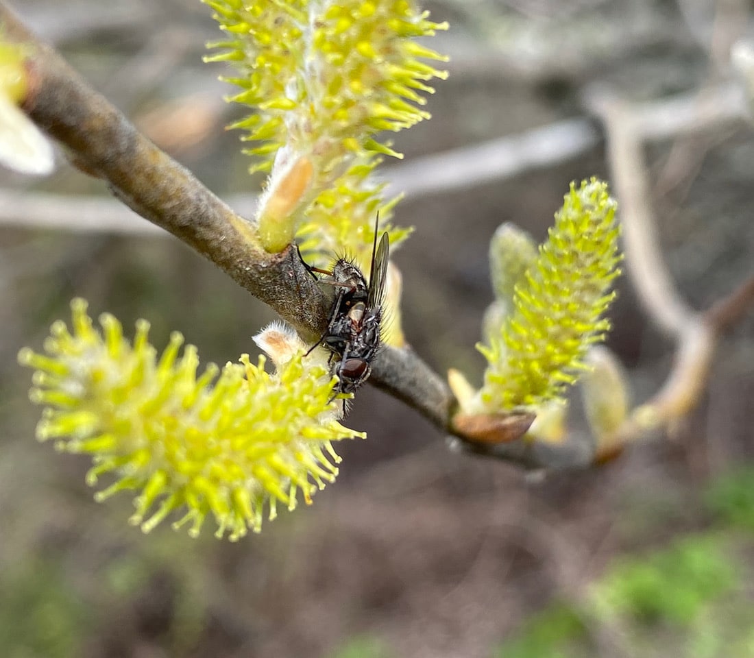 The honey bees are not the only insects enjoying the largesse of the Willow flowers. Here’s a Sedgesitter, Platycheirus sp. (family Syrphidae) seeking nectar from a female catkin. The fly’s dusky, metallic sheen distinguishes it from most other hover flies.