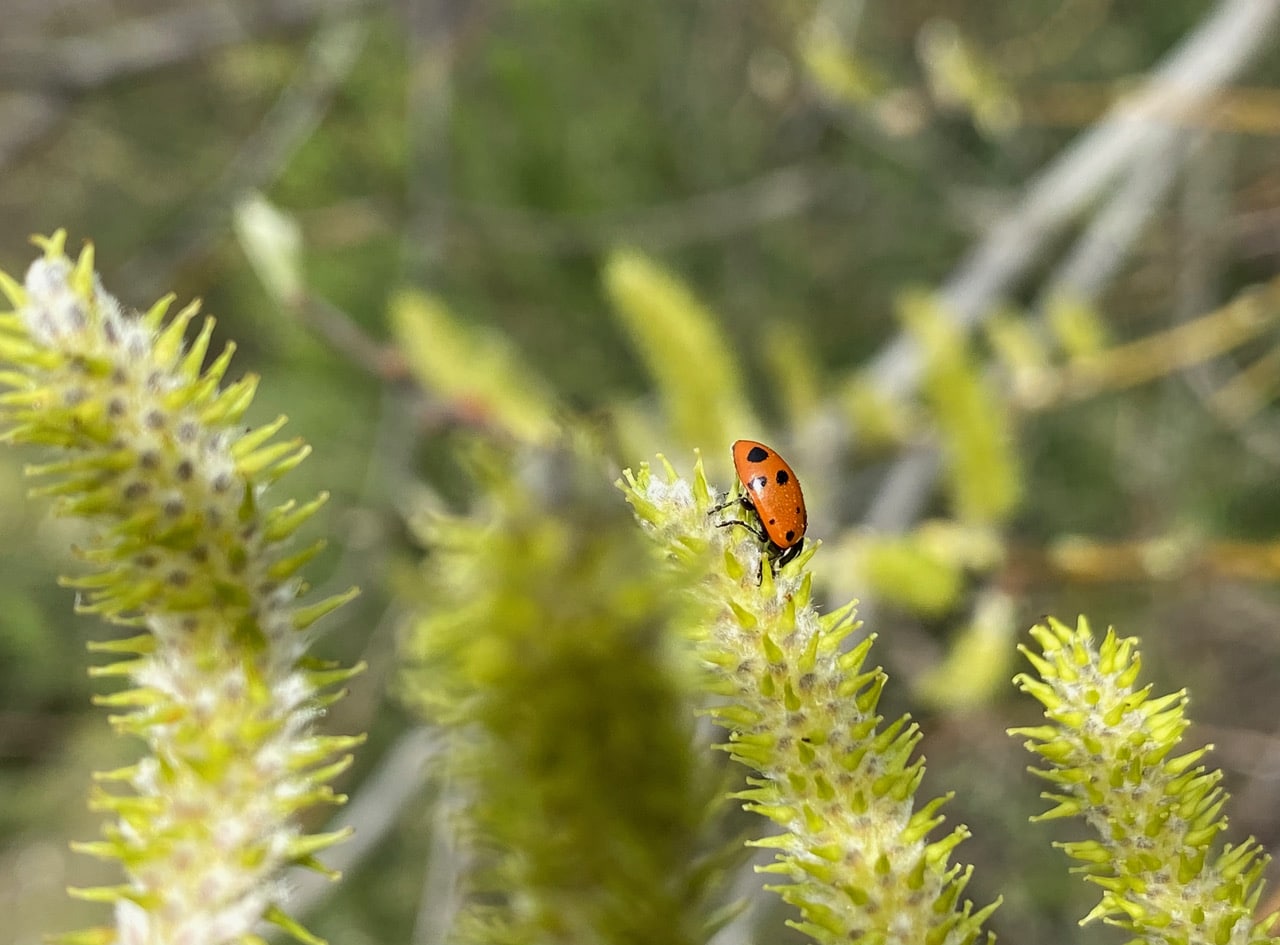 A Ladybeetle on the willow catkin! While there might be aphids and other small insect prey in the catkin, the Convergent Ladybeetles, Hippodamia convergens (family Coccinellidae) are known to feed on pollen and nectar from flowers when prey is scarce.