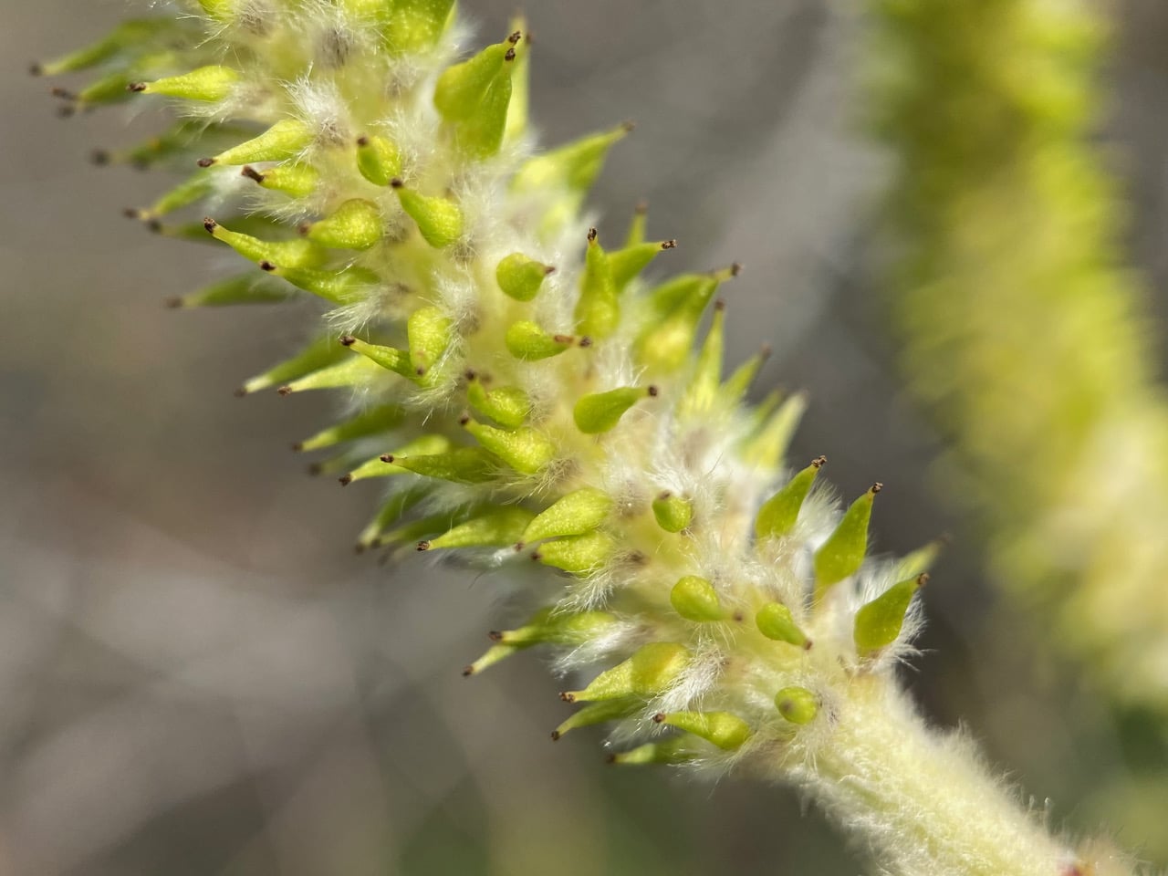 Female flowers consist of a green, bowling-pin-shaped pistil and a small stalk. The ovary and style tapers to two, small, two-lobed stigmas. As in the male catkins, the female flowers also has nectaries at the bases.
