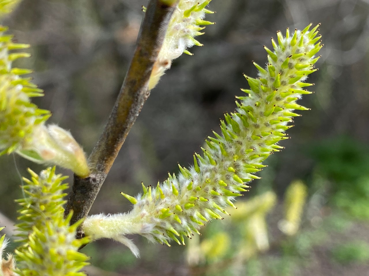Just a stone’s throw away, a female Arroyo Willow is in bloom. Female catkins are slightly smaller than the male, and green in color.