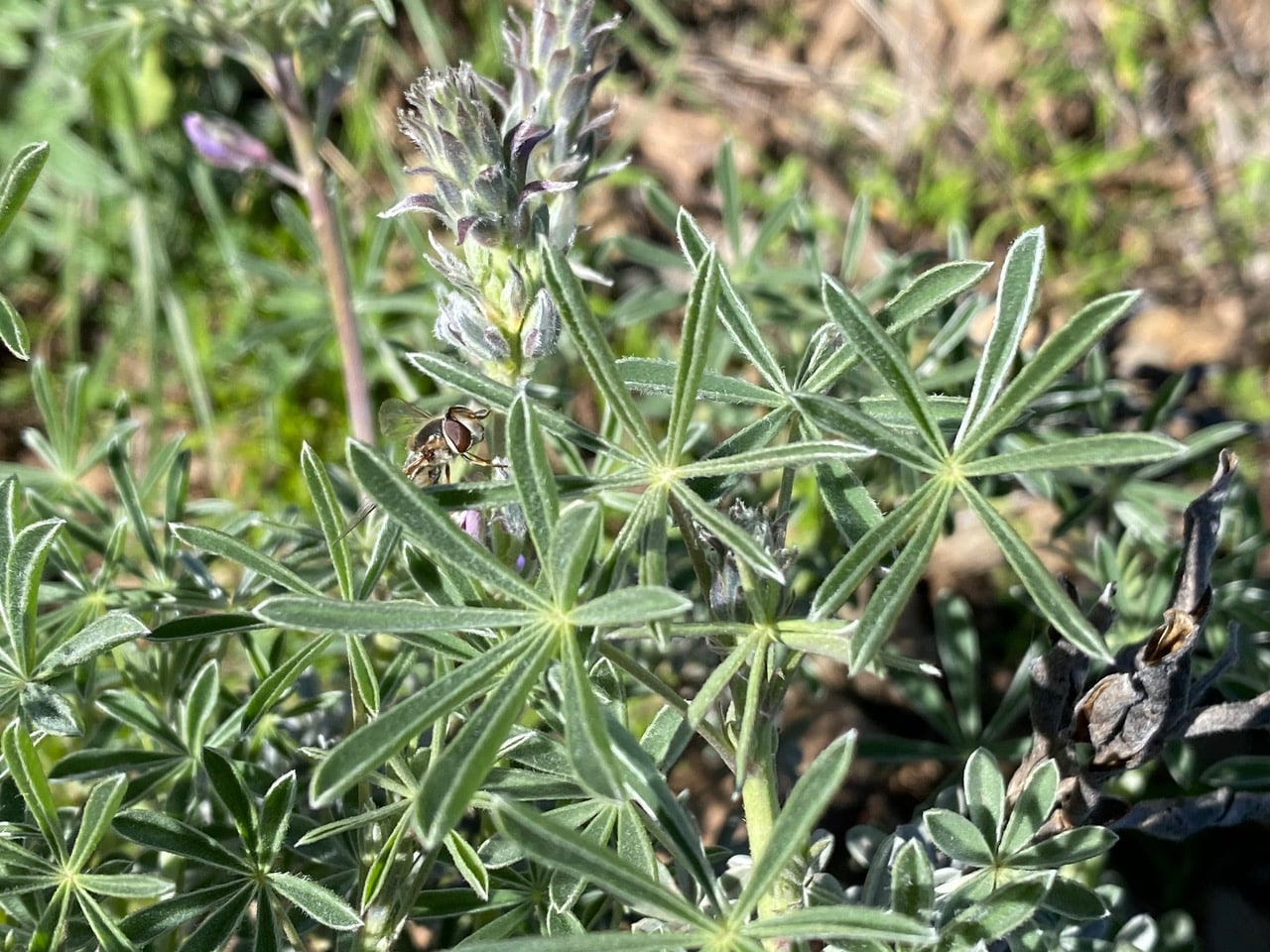 There is another species of bees flying around the stand of lupines. About the size of worker bumble bees, these stout, gray bees are fast and noisy flyers. They are also bold, hovering in front of me to check me out, but never allowing themselves to be photographed. I think they are the Digger Bees in the genus Habropoda. Females are solitary and nest in soil, often in vertical banks.